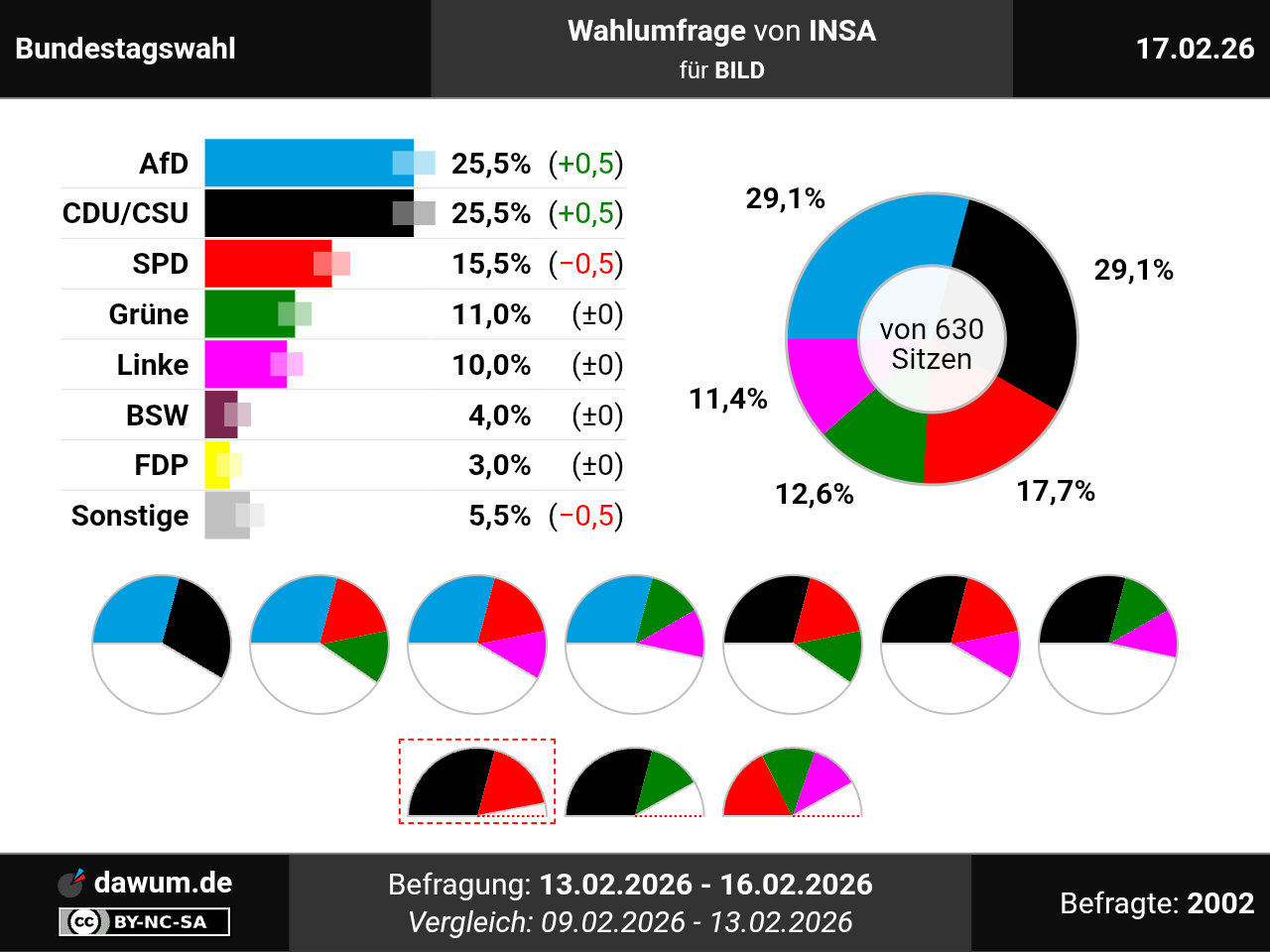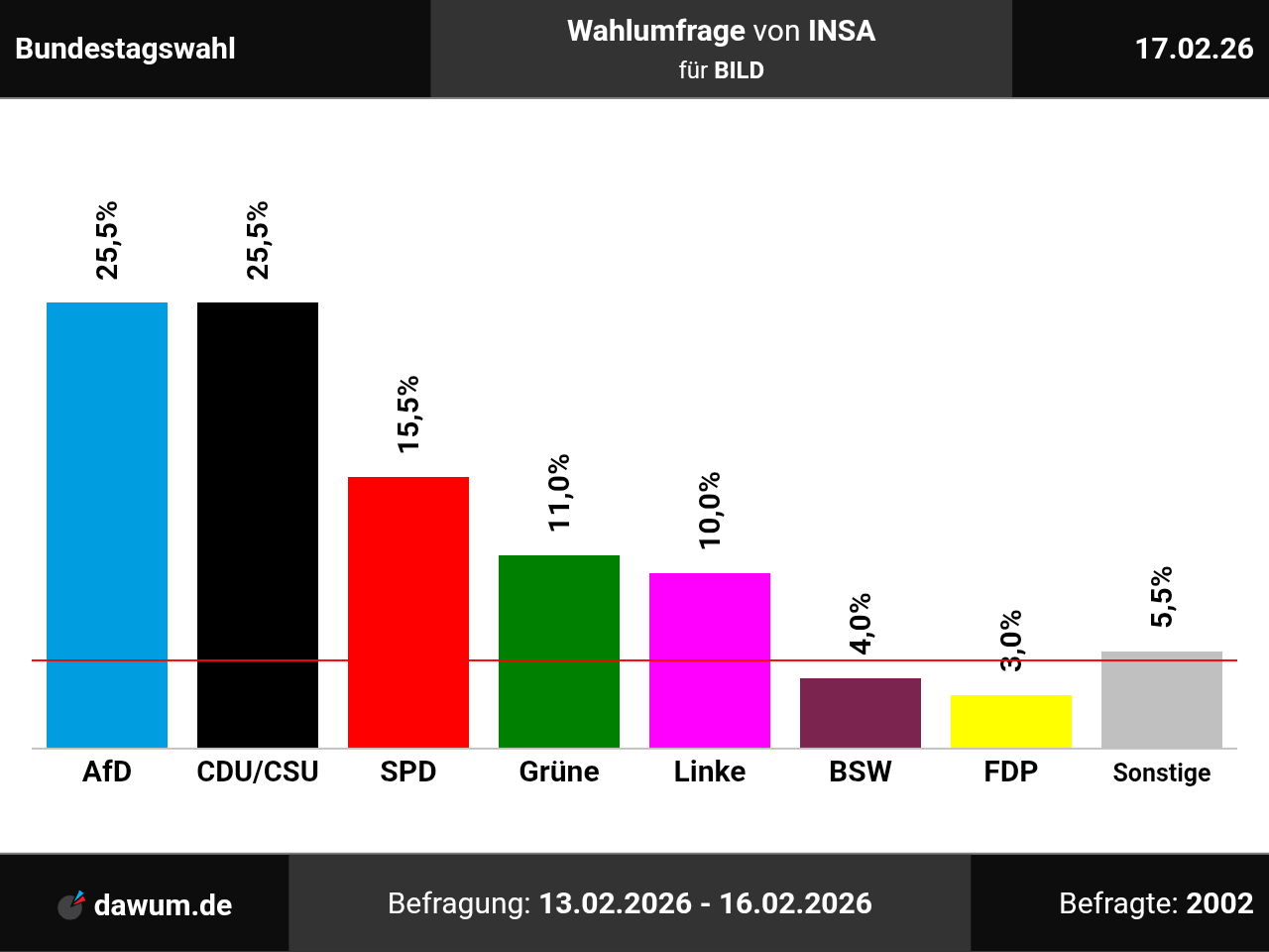 Diese Wahlumfrage (Sonntagsfrage) zur Bundestagswahl wurde von INSA im Auftrag von BILD durchgeführt und am 17.02.2026 insbesondere bei youtu.be veröffentlicht. Die Online-Befragung fand zwischen dem 13.02.2026 und dem 16.02.2026 bei 2002 Wahlberechtigten statt.
