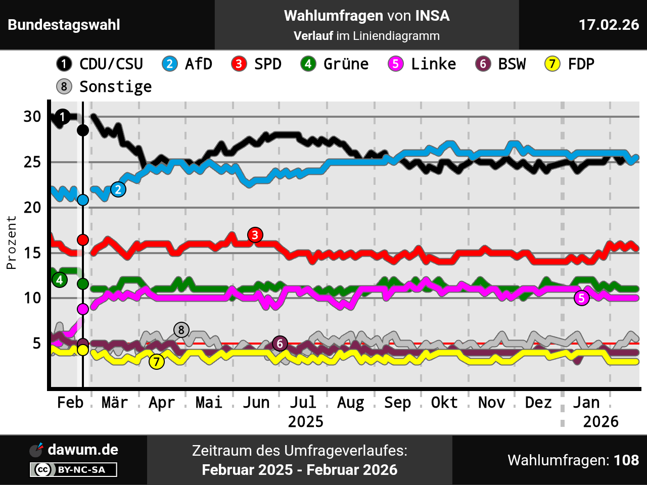 Umfrageverlauf bei INSA von Februar 2025 bis Februar 2026