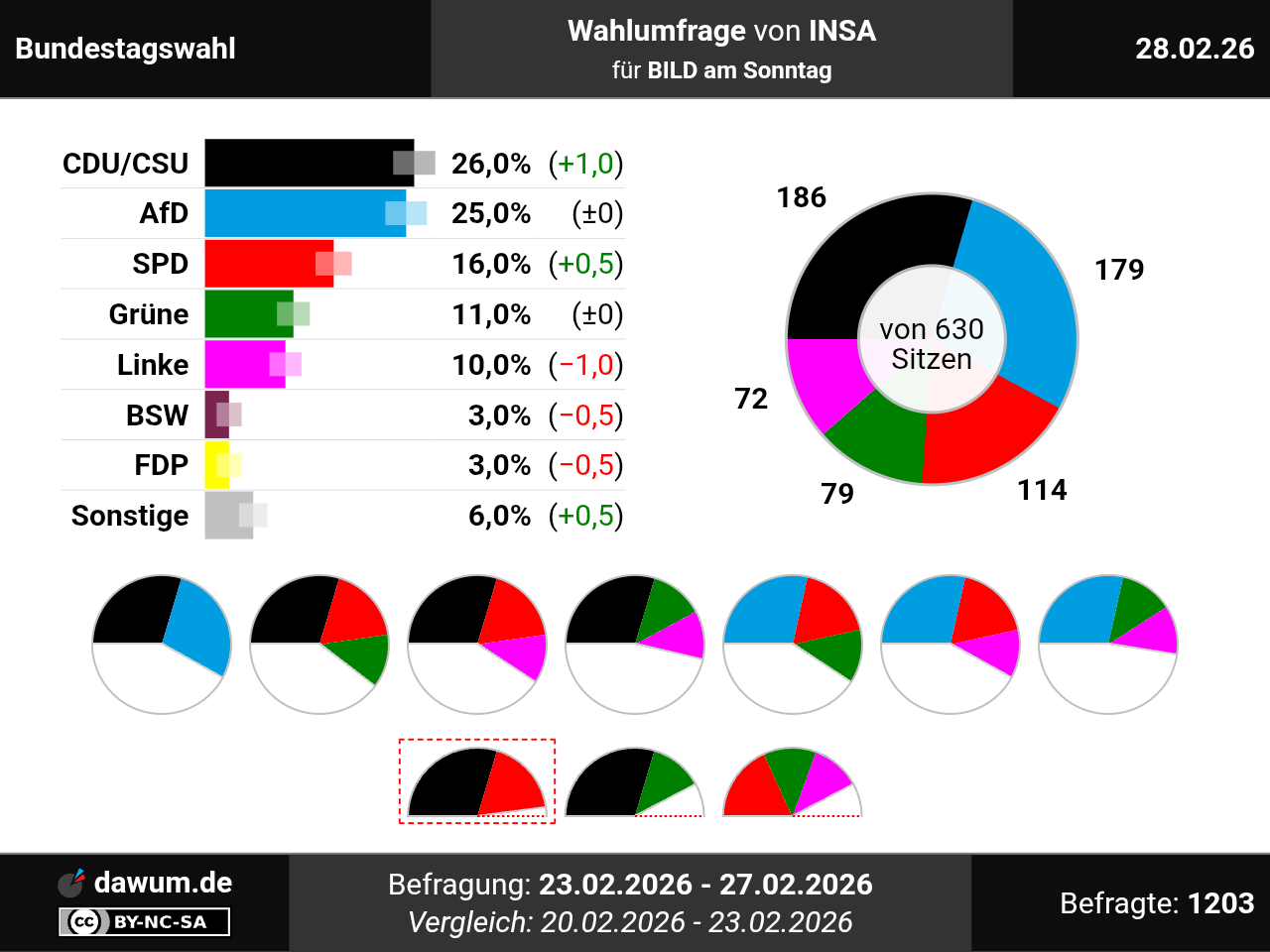Diese Wahlumfrage (Sonntagsfrage) zur Bundestagswahl wurde von INSA im Auftrag von BILD am Sonntag durchgeführt und am 28.02.2026 insbesondere bei bild.de veröffentlicht. Die Mixed-Befragung (telefonisch und online) fand zwischen dem 23.02.2026 und dem 27.02.2026 bei 1203 Wahlberechtigten statt.
