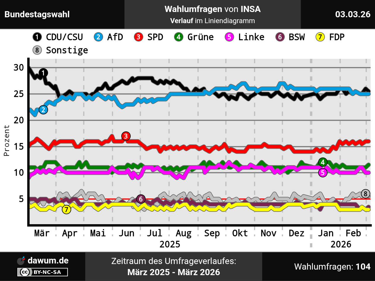 Umfrageverlauf bei INSA von März 2025 bis März 2026
