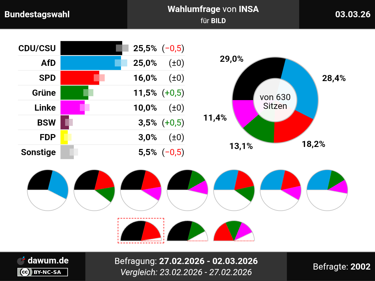 Diese Wahlumfrage (Sonntagsfrage) zur Bundestagswahl wurde von INSA im Auftrag von BILD durchgeführt und am 03.03.2026 insbesondere bei youtu.be veröffentlicht. Die Online-Befragung fand zwischen dem 27.02.2026 und dem 02.03.2026 bei 2002 Wahlberechtigten statt.