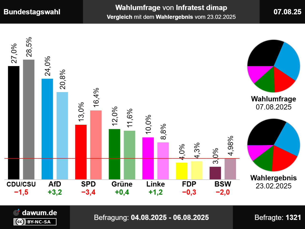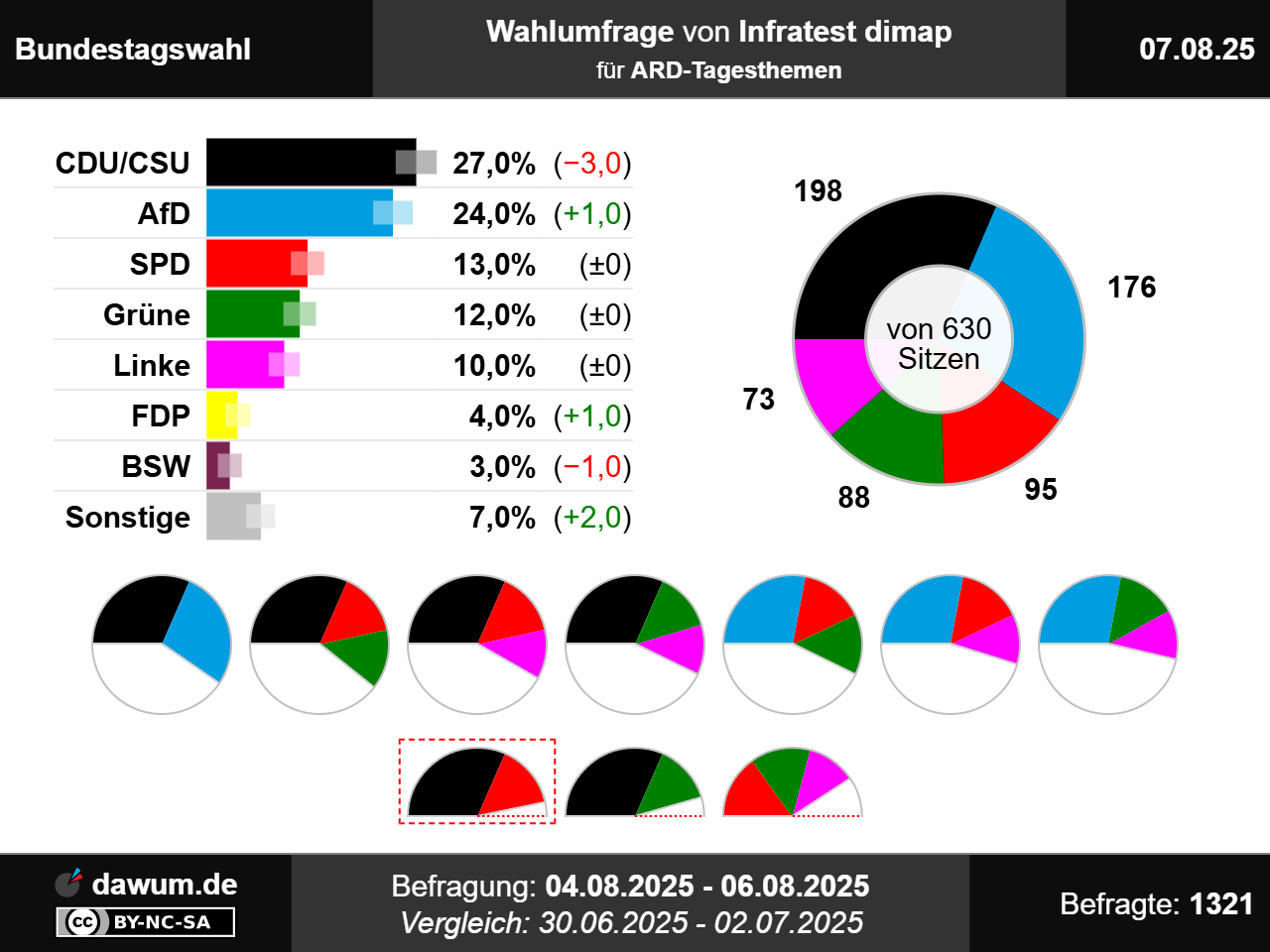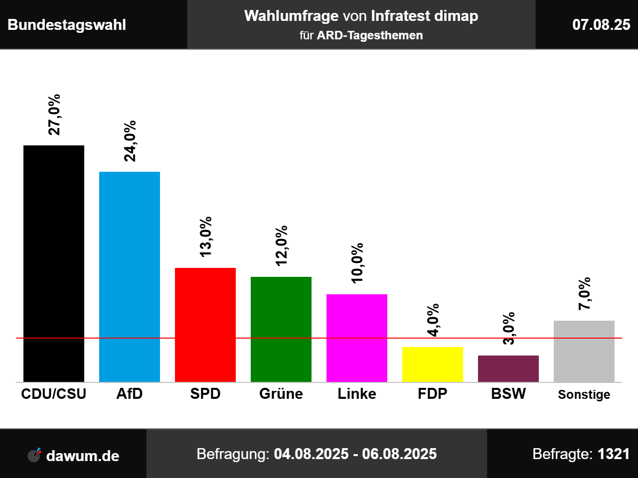 Diese Wahlumfrage (Sonntagsfrage) zur Bundestagswahl wurde von Infratest dimap im Auftrag von ARD-Tagesthemen durchgeführt und am 07.08.2025 insbesondere bei tagesschau.de veröffentlicht. Die Mixed-Befragung (telefonisch und online) fand zwischen dem 04.08.2025 und dem 06.08.2025 bei 1321 Wahlberechtigten statt.