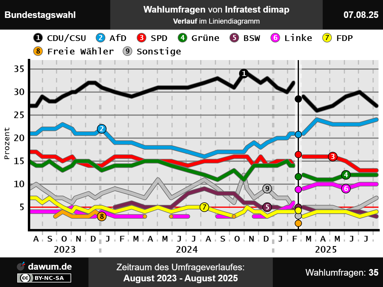 Umfrageverlauf bei Infratest dimap von August 2023 bis August 2025