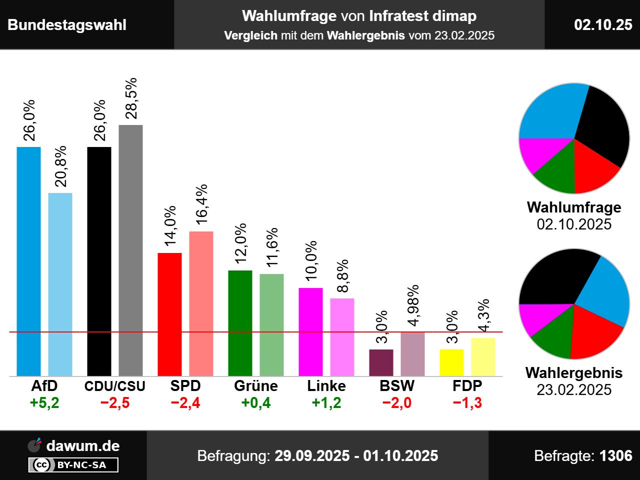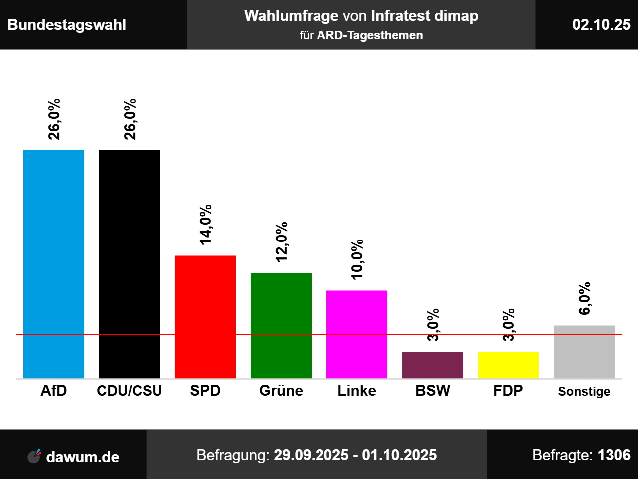 Diese Wahlumfrage (Sonntagsfrage) zur Bundestagswahl wurde von Infratest dimap im Auftrag von ARD-Tagesthemen durchgeführt und am 02.10.2025 insbesondere bei tagesschau.de veröffentlicht. Die Mixed-Befragung (telefonisch und online) fand zwischen dem 29.09.2025 und dem 01.10.2025 bei 1306 Wahlberechtigten statt.