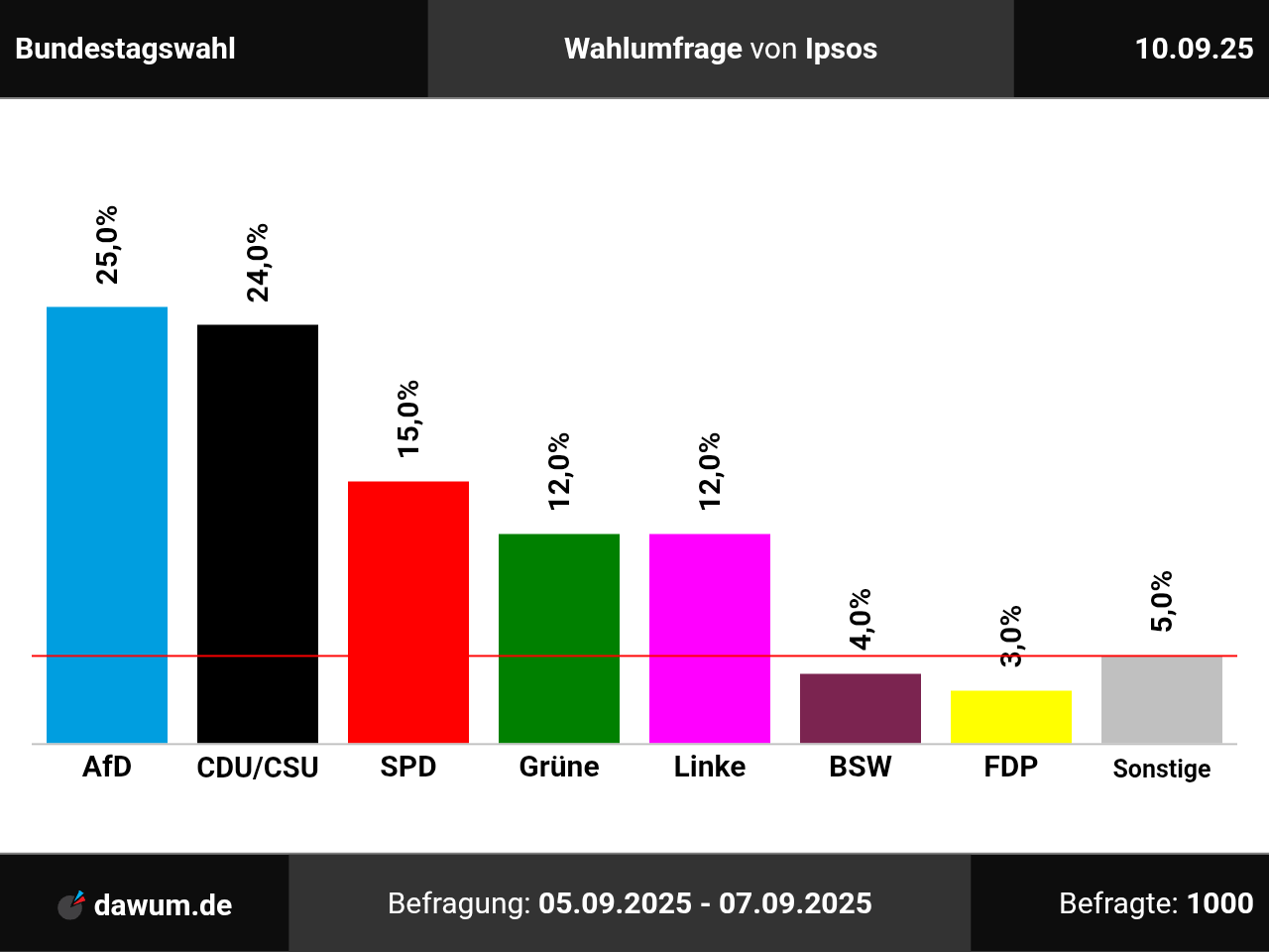 Nach dieser Wahlumfrage würden die AfD 25%, die Union (CDU/CSU) 24%, die SPD 15%, Bündnis 90/Die Grünen und Die Linke jeweils 12%, die sonstigen Parteien 5%, das Bündnis Sahra Wagenknecht 4% sowie die FDP 3% erhalten. Im Vergleich zur vorherigen Wahlumfrage vom 07.08.2025 gewinnen Bündnis 90/Die Grünen und Die Linke jeweils 1 Prozentpunkt(e) hinzu, während die Union (CDU/CSU) und das Bündnis Sahra Wagenknecht jeweils 1 Prozentpunkt(e) verlieren. Sofern eine Partei zuvor nicht aufgeführt wurde, wird beim Vergleich n.a. angezeigt.