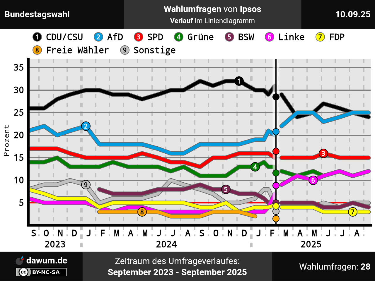 Umfrageverlauf bei Ipsos von September 2023 bis September 2025