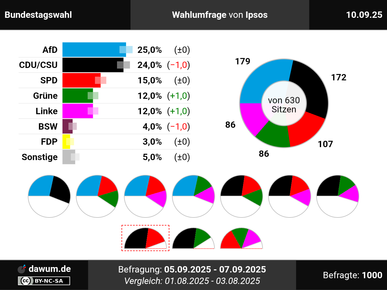 Diese Wahlumfrage (Sonntagsfrage) zur Bundestagswahl wurde von Ipsos in eigenem Auftrag durchgeführt und am 10.09.2025 insbesondere bei ipsos.com und ipsos.com (jpg) veröffentlicht. Die Online-Befragung fand zwischen dem 05.09.2025 und dem 07.09.2025 bei 1000 Wahlberechtigten statt.