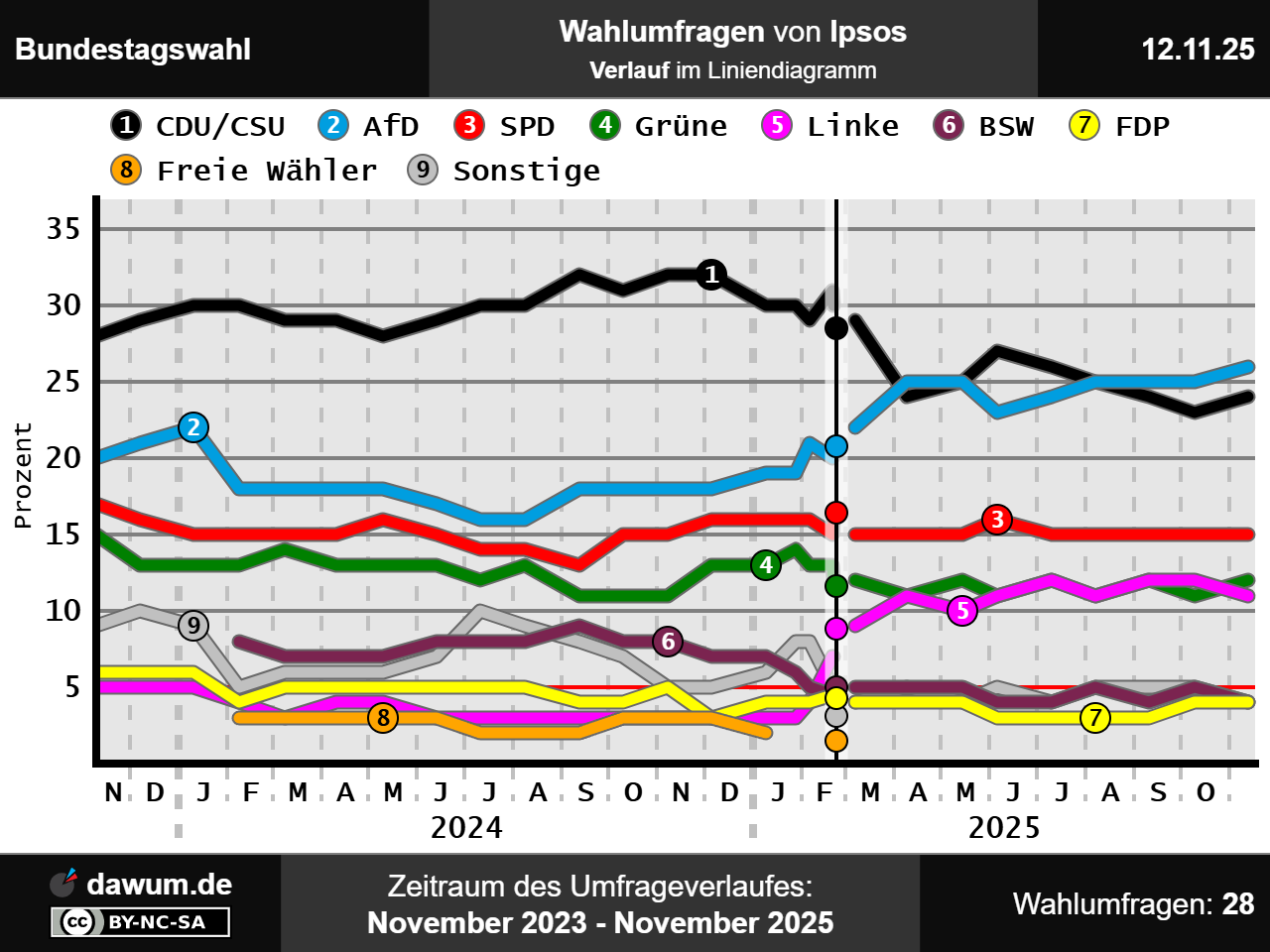 Diese Wahlumfrage (Sonntagsfrage) zur Bundestagswahl wurde von Ipsos in eigenem Auftrag durchgeführt und am 12.11.2025 insbesondere bei ipsos.com und ipsos.com (jpg) veröffentlicht. Die Online-Befragung fand zwischen dem 07.11.2025 und dem 09.11.2025 bei 1000 Wahlberechtigten statt.