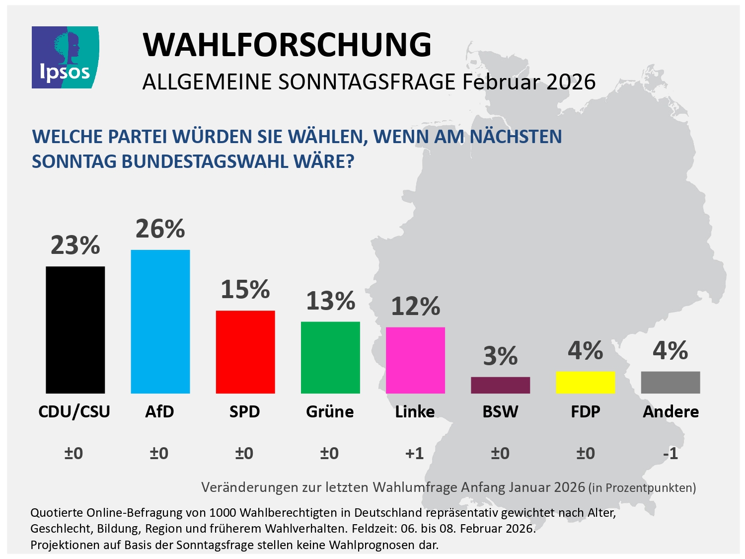 Diese Wahlumfrage (Sonntagsfrage) zur Bundestagswahl wurde von Ipsos in eigenem Auftrag durchgeführt und am 16.02.2026 insbesondere bei ipsos.com und ipsos.com (jpg) veröffentlicht. Die Online-Befragung fand zwischen dem 06.02.2026 und dem 08.02.2026 bei 1000 Wahlberechtigten statt.