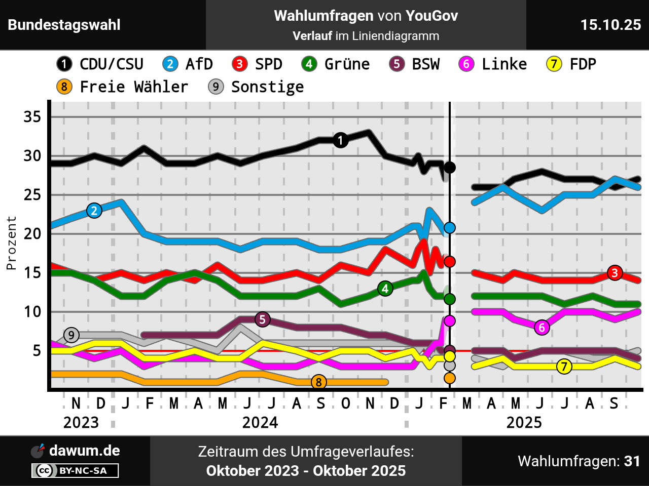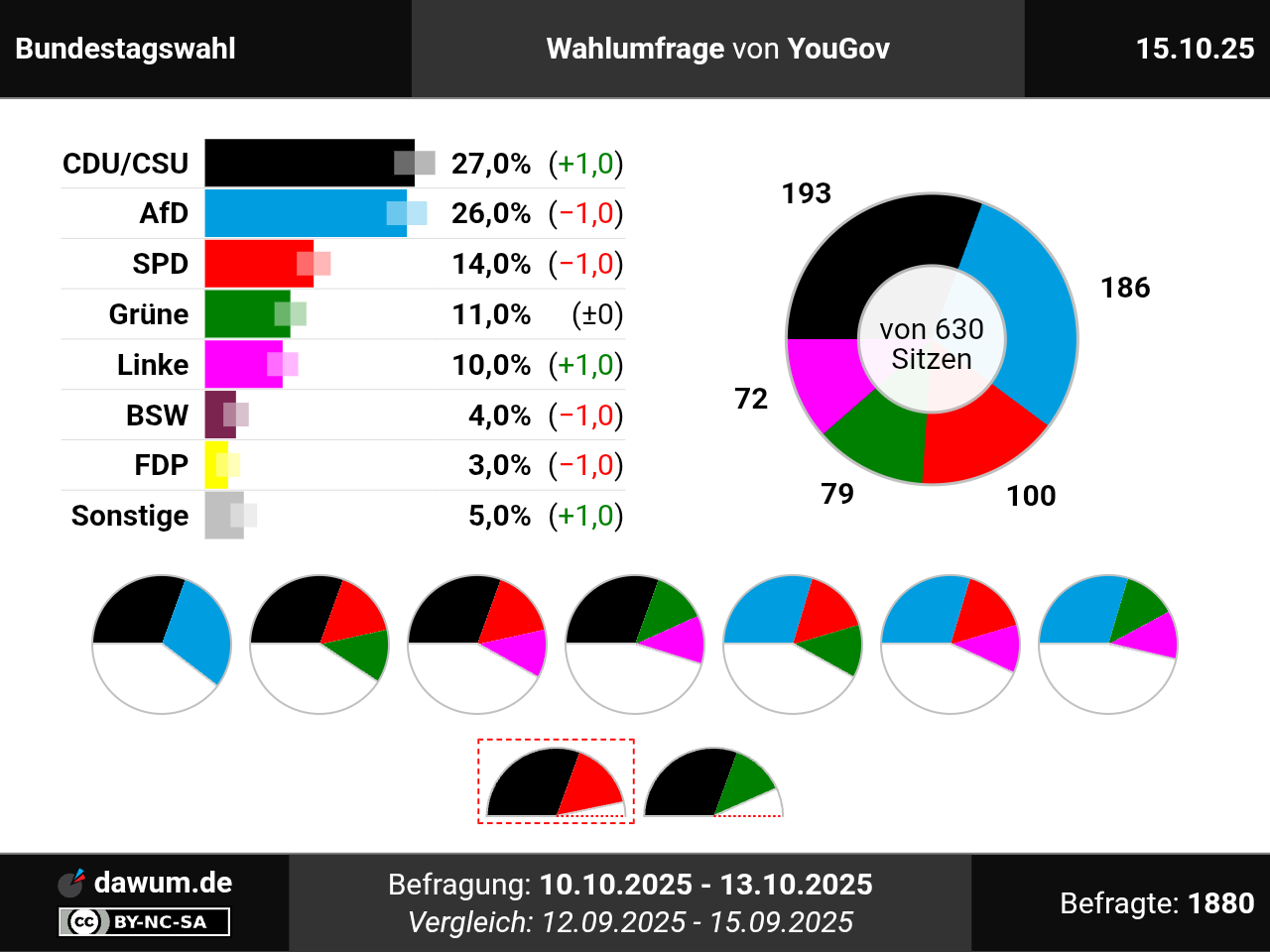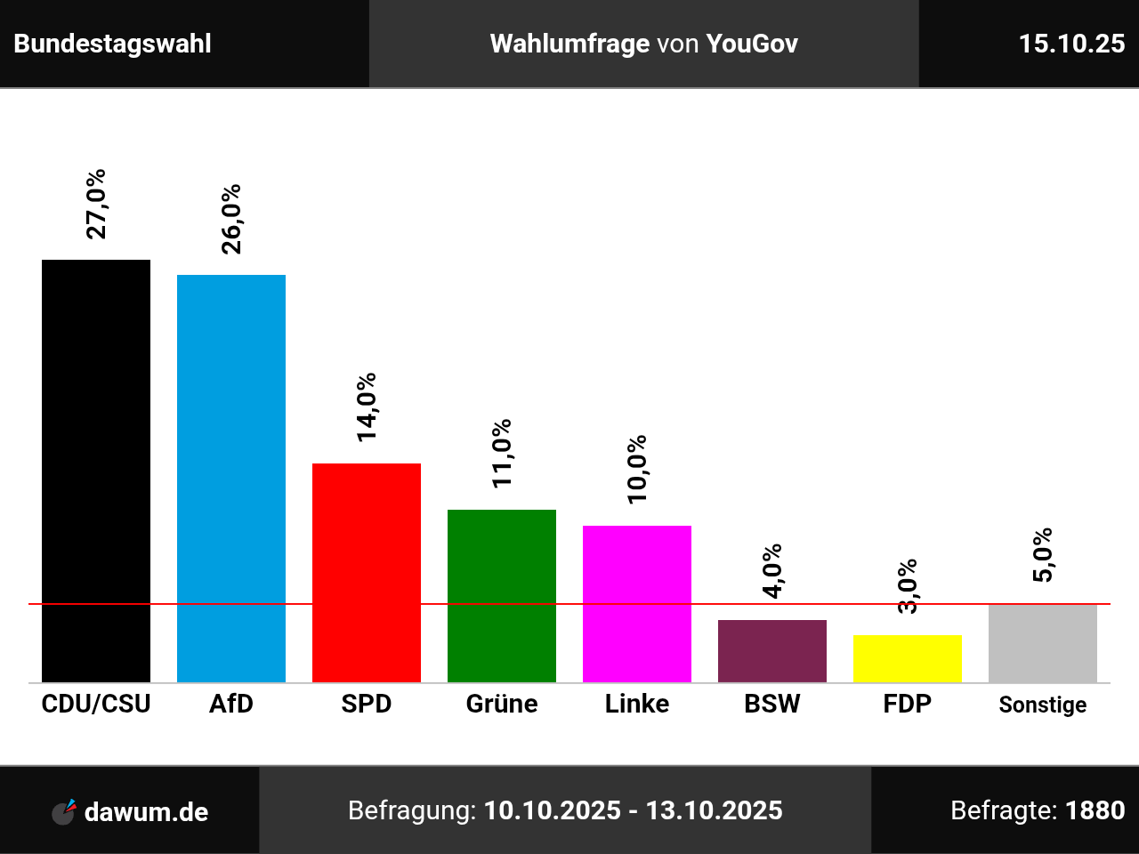 Diese Wahlumfrage (Sonntagsfrage) zur Bundestagswahl wurde von YouGov in eigenem Auftrag durchgeführt und am 15.10.2025 insbesondere bei yougov.de veröffentlicht. Die Online-Befragung fand zwischen dem 10.10.2025 und dem 13.10.2025 bei 1880 Wahlberechtigten statt.