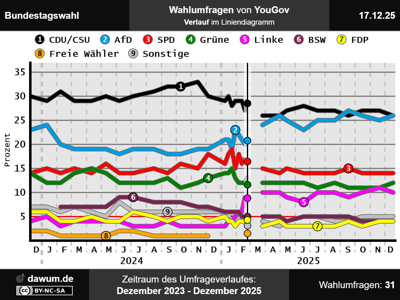 Diese Wahlumfrage (Sonntagsfrage) zur Bundestagswahl wurde von YouGov in eigenem Auftrag durchgeführt und am 17.12.2025 insbesondere bei yougov.de veröffentlicht. Die Online-Befragung fand zwischen dem 12.12.2025 und dem 15.12.2025 bei 1743 Wahlberechtigten statt.