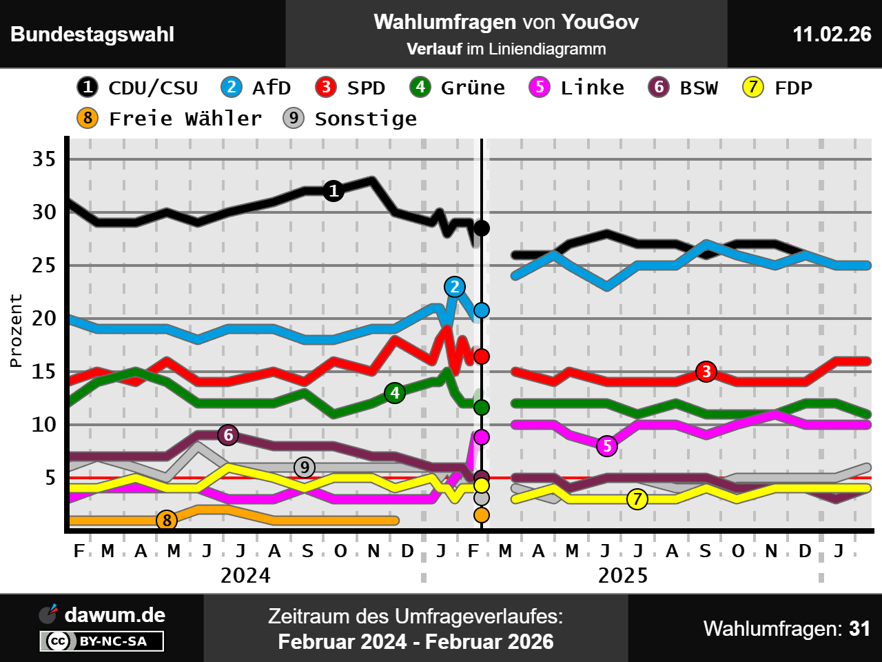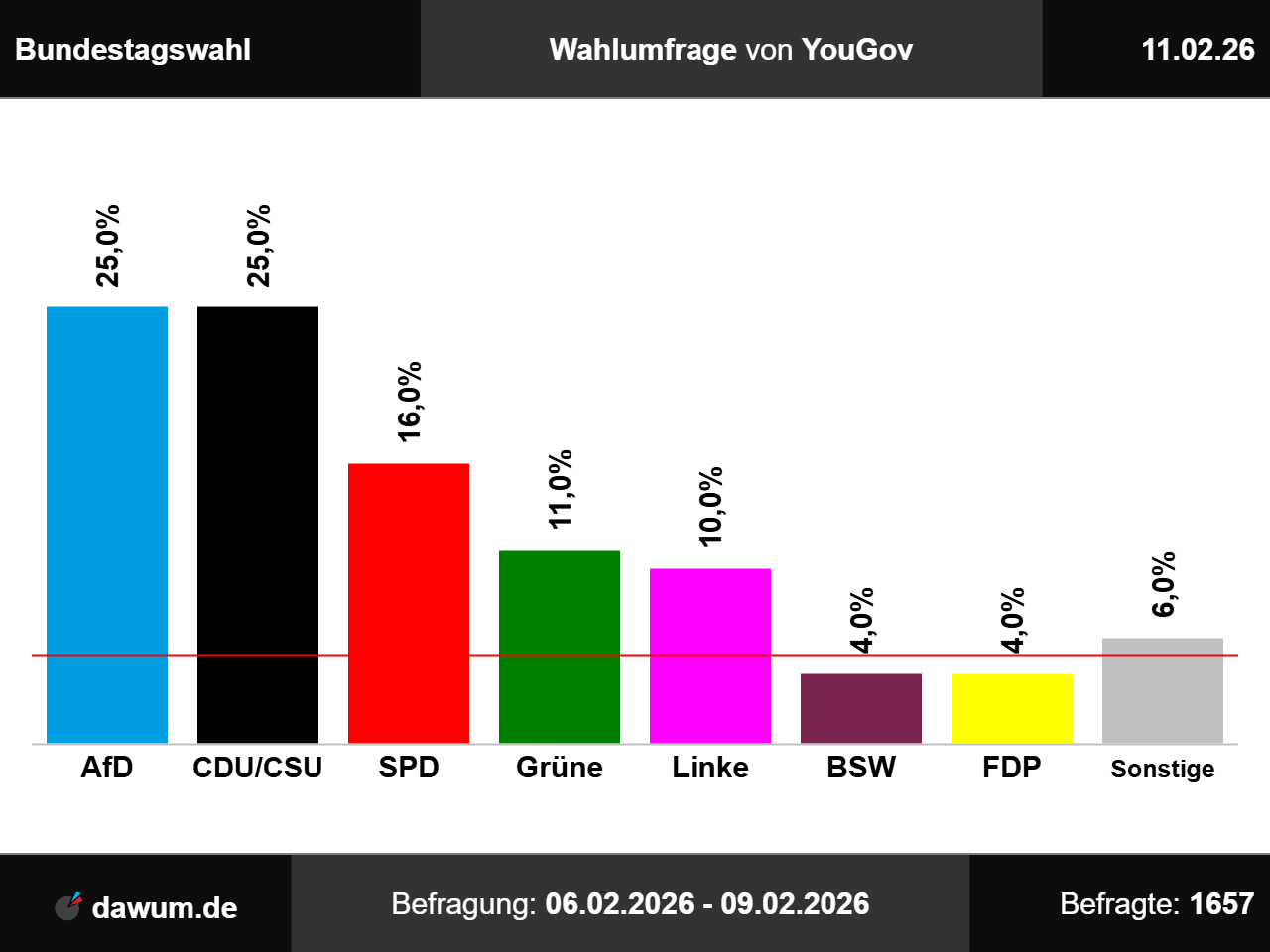 Diese Wahlumfrage (Sonntagsfrage) zur Bundestagswahl wurde von YouGov in eigenem Auftrag durchgeführt und am 11.02.2026 insbesondere bei yougov.de veröffentlicht. Die Online-Befragung fand zwischen dem 06.02.2026 und dem 09.02.2026 bei 1657 Wahlberechtigten statt.