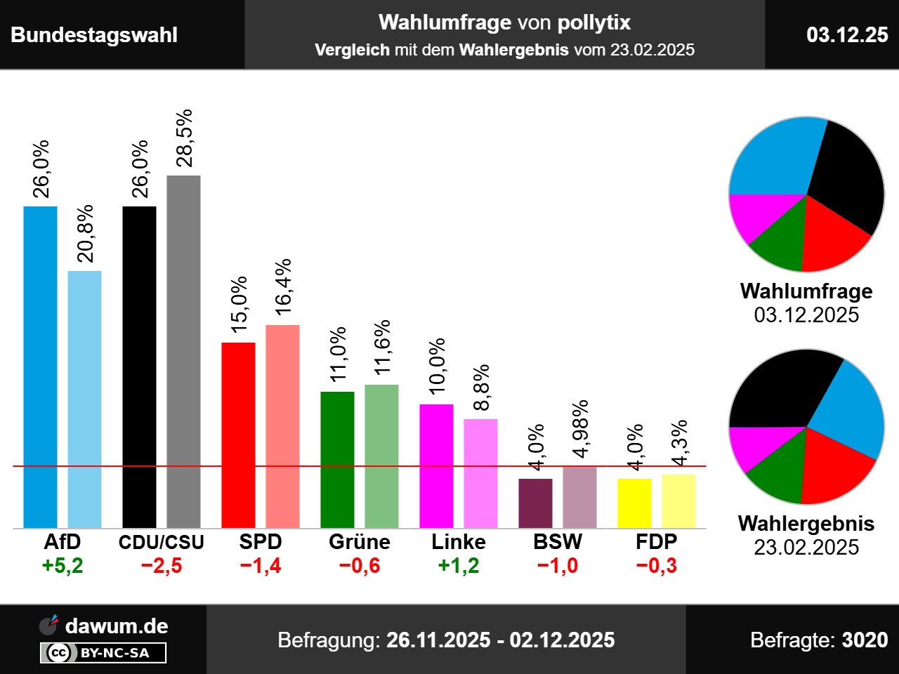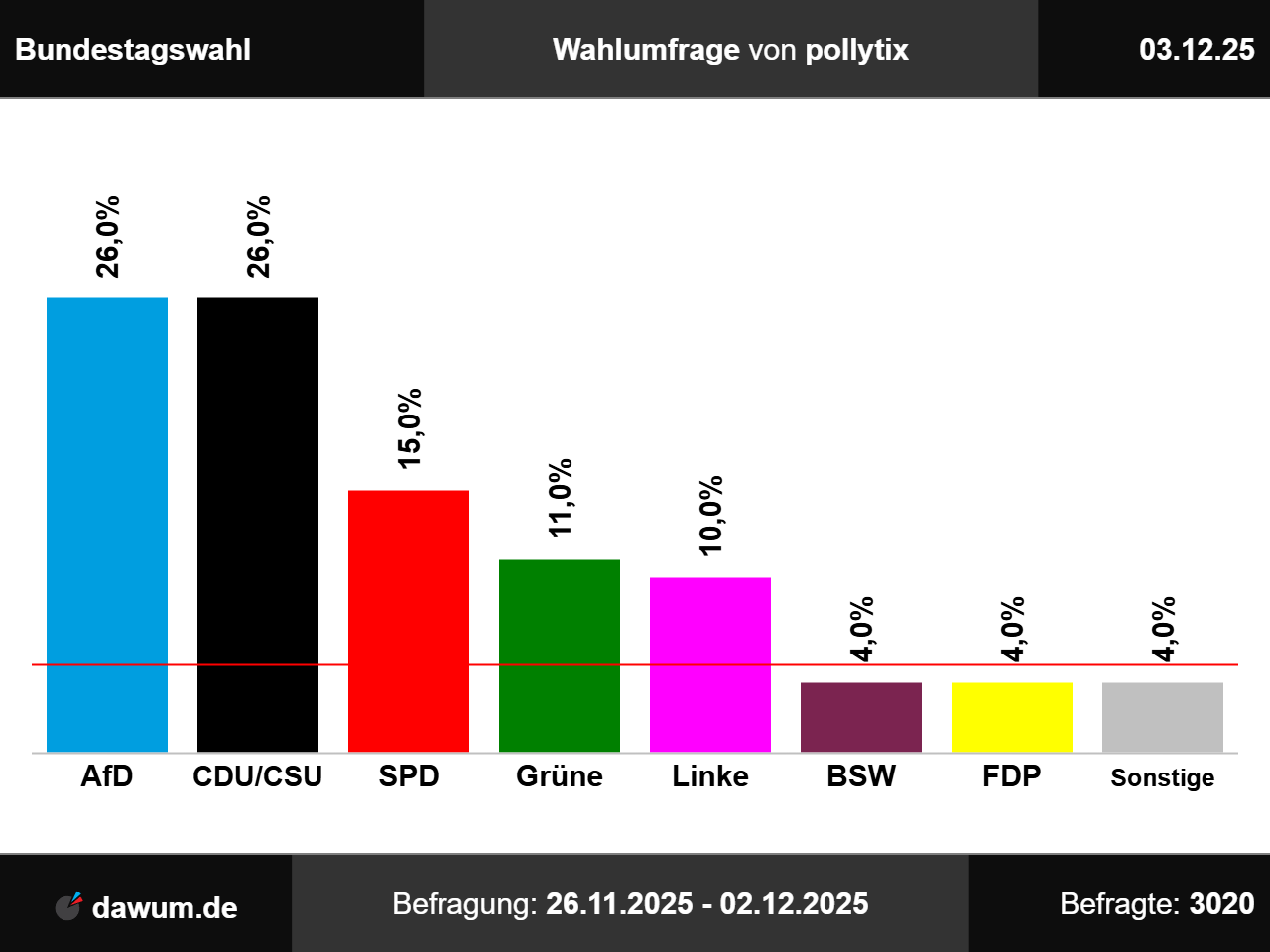 Die neueste Wahlumfrage (Sonntagsfrage) von pollytix zur Bundestagswahl wurde in eigenem Auftrag durchgeführt und am 03.12.2025 insbesondere bei wahlrecht.de veröffentlicht. Die Online-Befragung fand zwischen dem 26.11.2025 und dem 02.12.2025 bei 3020 Wahlberechtigten statt.