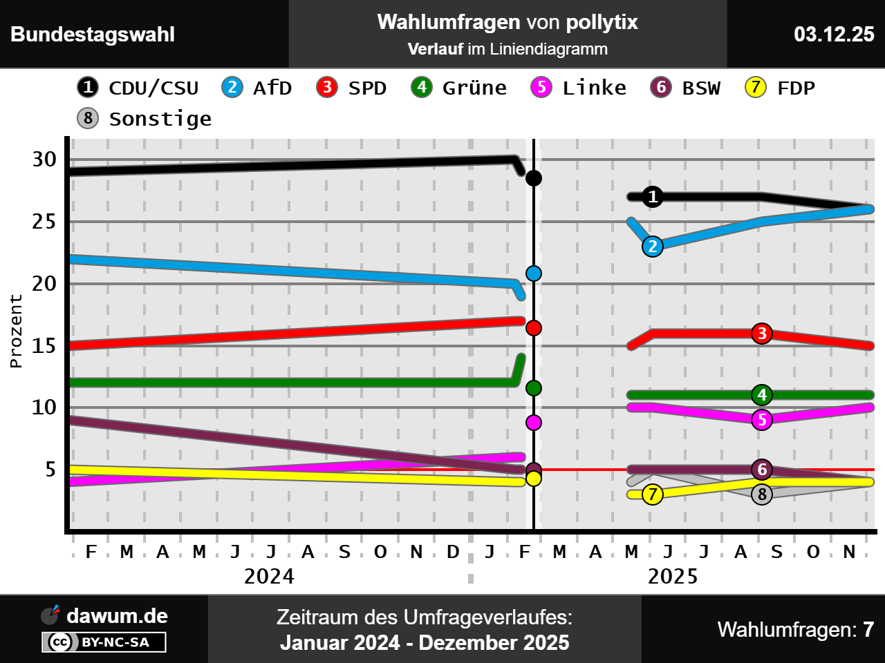 Umfrageverlauf bei pollytix von Januar 2024 bis Dezember 2025