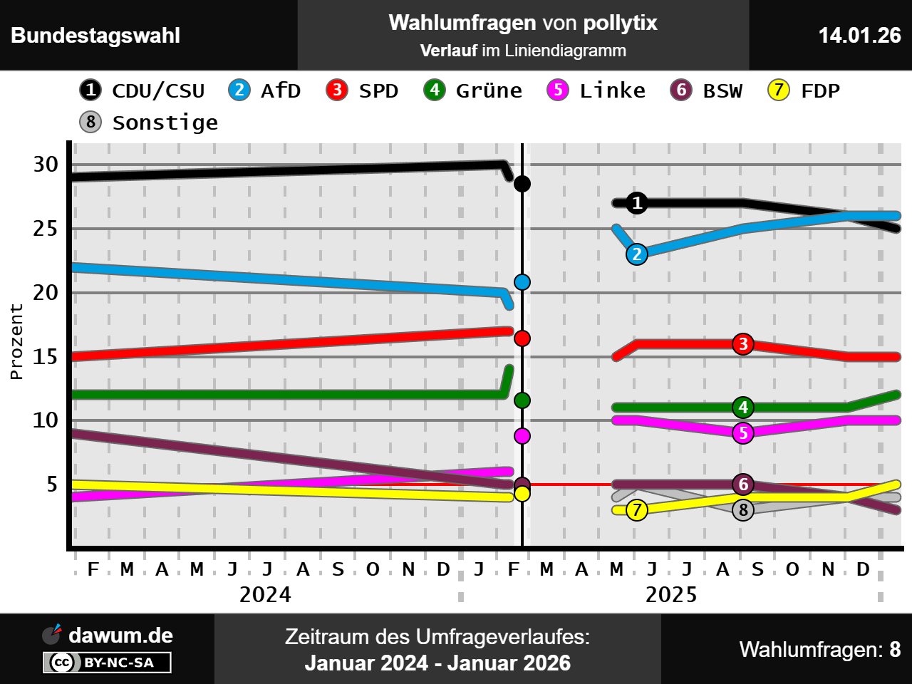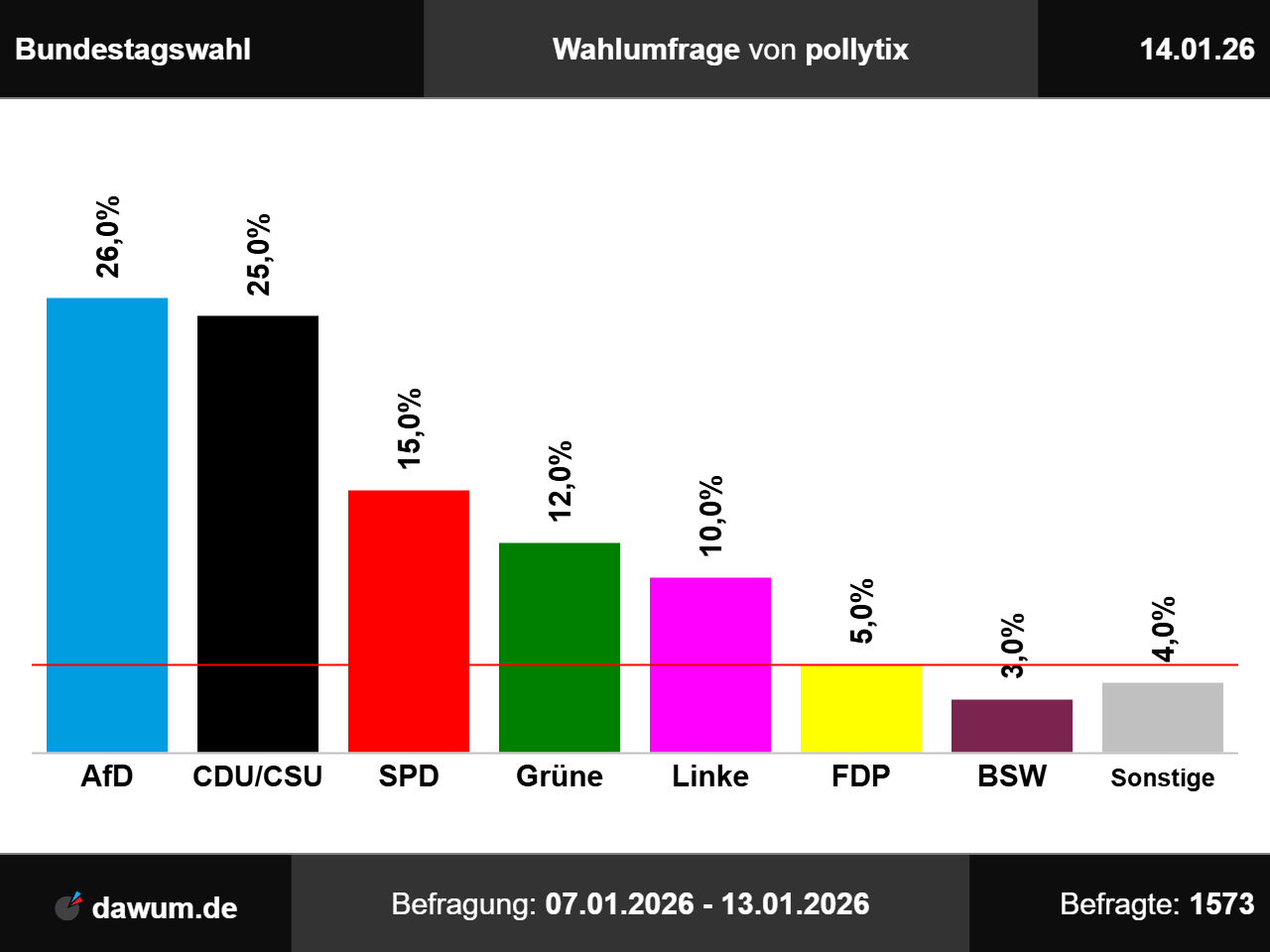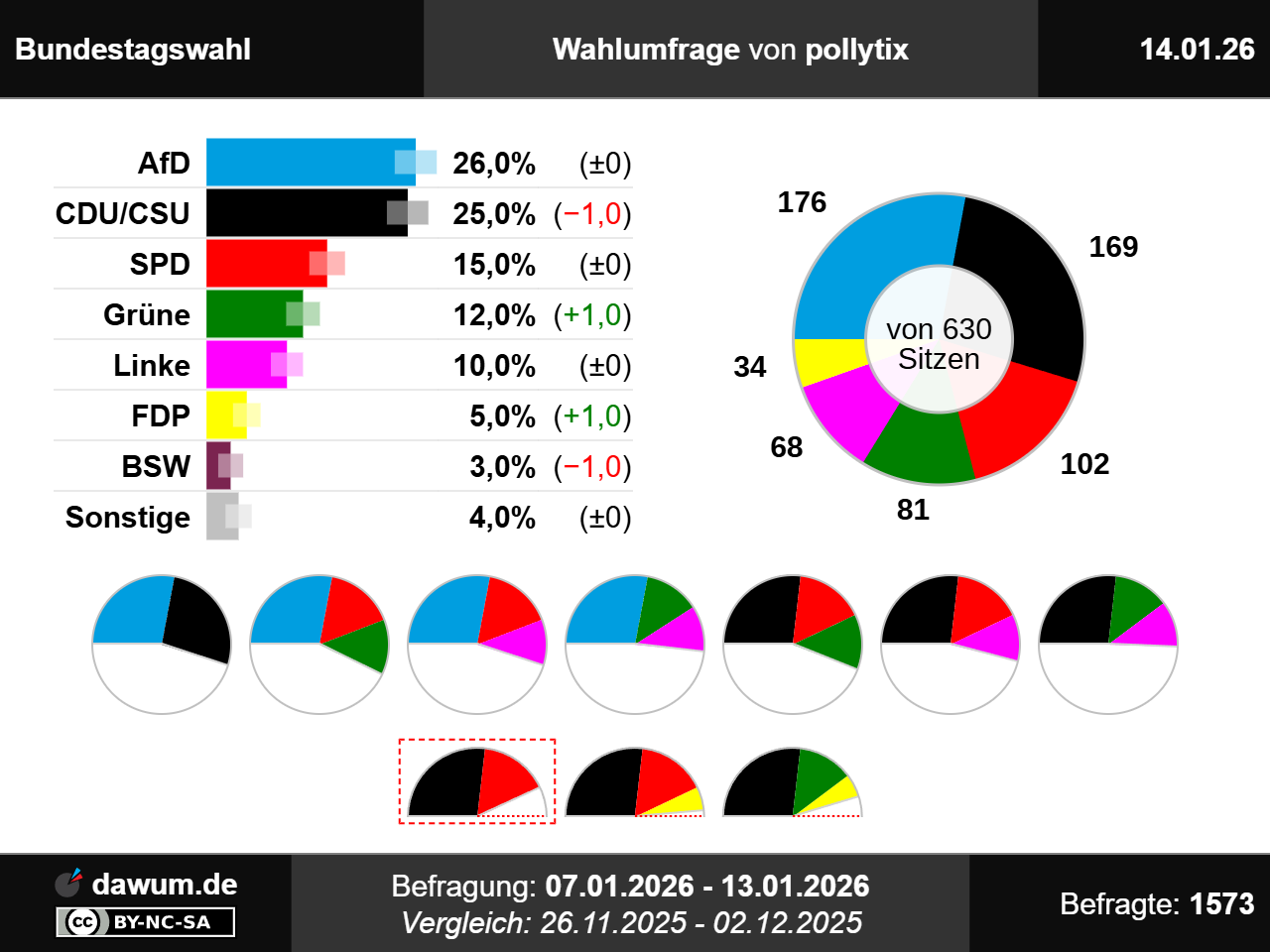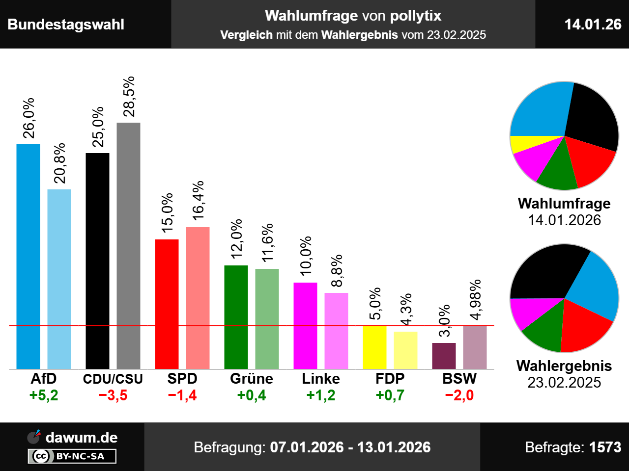 Diese Wahlumfrage (Sonntagsfrage) zur Bundestagswahl wurde von pollytix in eigenem Auftrag durchgeführt und am 14.01.2026 insbesondere bei wahlrecht.de veröffentlicht. Die Online-Befragung fand zwischen dem 07.01.2026 und dem 13.01.2026 bei 1573 Wahlberechtigten statt.