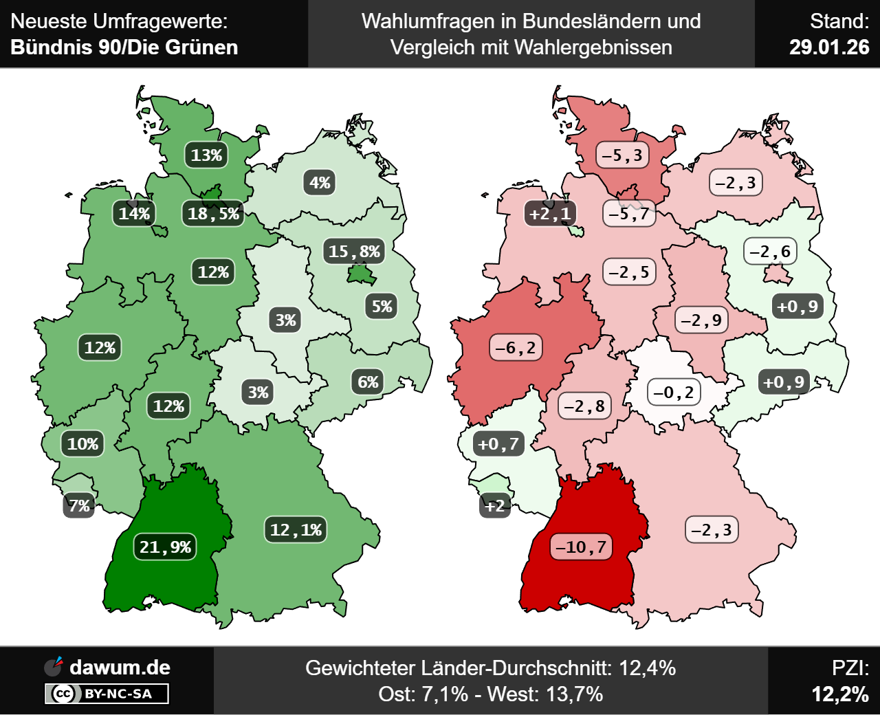 Im neuesten Wahltrend zur Bundestagswahl hat Bündnis 90/Die Grünen aktuell 12,4%. In den Bundesländern kommt Bündnis 90/Die Grünen im nach Einwohnern gewichteten Durchschnitt zu den Landtagswahlen auf 12%, wobei er in den alten Bundesländern 13,1% und in den neuen Bundesländern (mit Berlin) 7% beträgt. Ihre höchsten aktuellen Umfragewerte erreicht Bündnis 90/Die Grünen in den Bundesländern Baden-Württemberg und Hamburg (jeweils 18,5%). Demgegenüber erreicht Bündnis 90/Die Grünen in den Bundesländern Sachsen-Anhalt und Thüringen (jeweils 3%) ihre niedrigsten aktuellen Umfragewerte. Der Parteizustimmungsindex (PZI) von Bündnis 90/Die Grünen beträgt aktuell 12,2%.