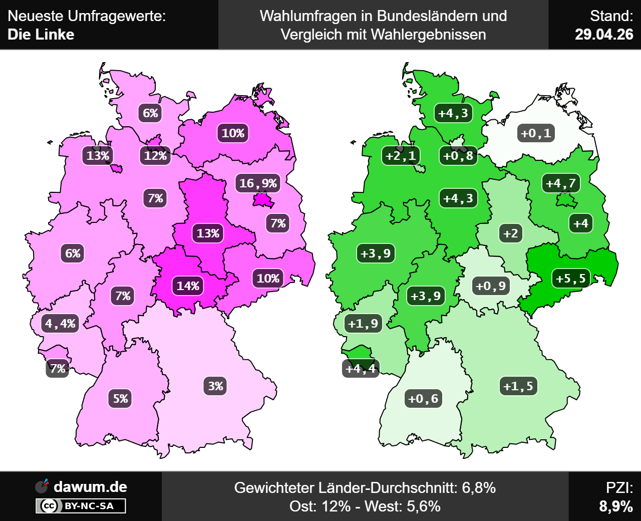 Im neuesten Wahltrend zur Bundestagswahl hat Die Linke aktuell 10,6%. In den Bundesländern kommt Die Linke im nach Einwohnern gewichteten Durchschnitt zu den Landtagswahlen auf 6,7%, wobei er in den alten Bundesländern 5,5% und in den neuen Bundesländern (mit Berlin) 11,7% beträgt. Ihre höchsten aktuellen Umfragewerte erreicht Die Linke in den Bundesländern Berlin (15,3%) sowie Thüringen (14%). Demgegenüber erreicht Die Linke im Bundesland Bayern (3%) ihren niedrigsten aktuellen Umfragewert. Der Parteizustimmungsindex (PZI) von Die Linke beträgt aktuell 8,7%.