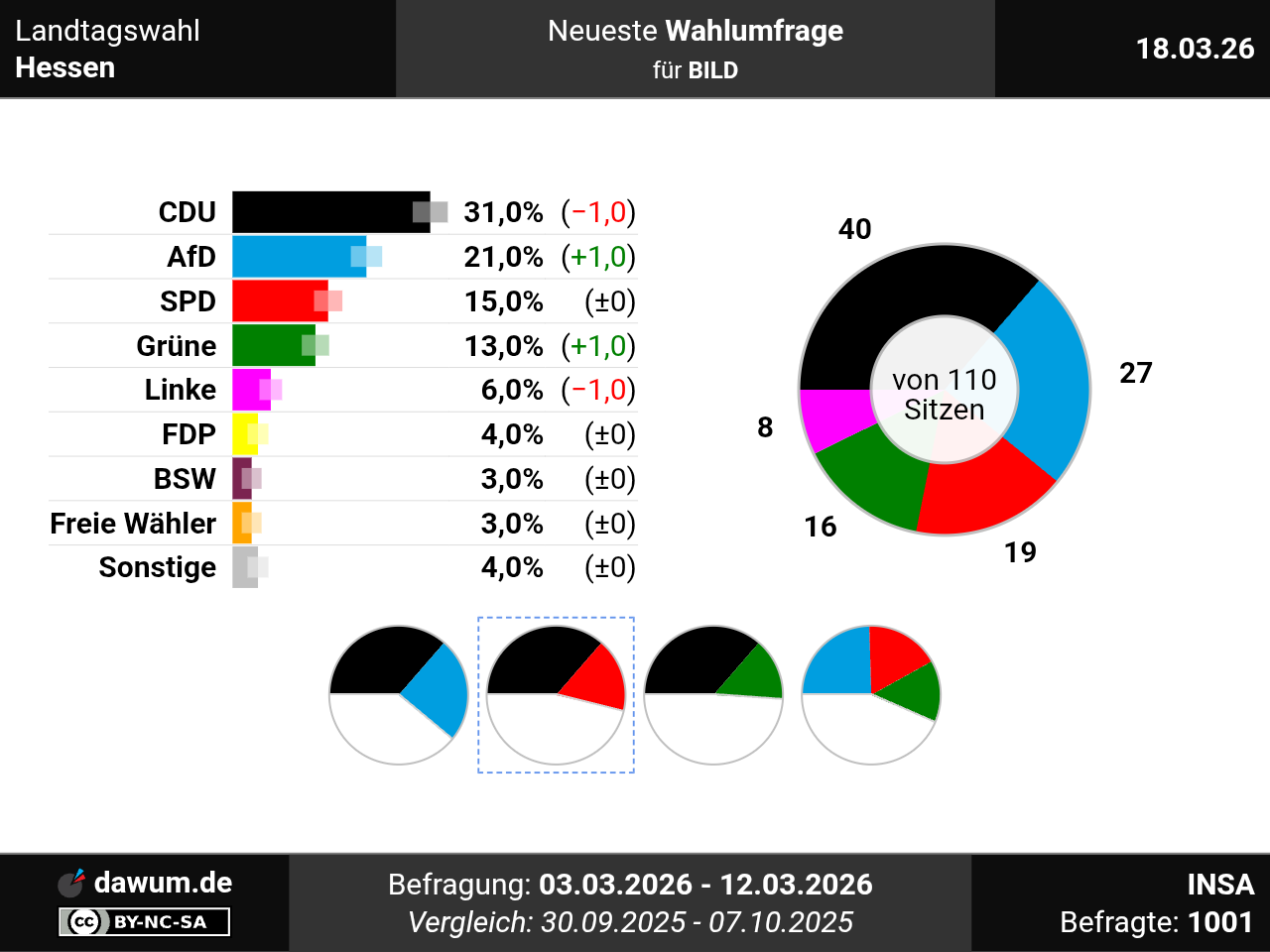 Die neueste Wahlumfrage (Sonntagsfrage) zur Landtagswahl in Hessen wurde von INSA im Auftrag von BILD durchgeführt und am 18.03.2026 insbesondere bei bild.de veröffentlicht. Die Online-Befragung fand zwischen dem 03.03.2026 und dem 12.03.2026 bei 1001 Wahlberechtigten statt.
