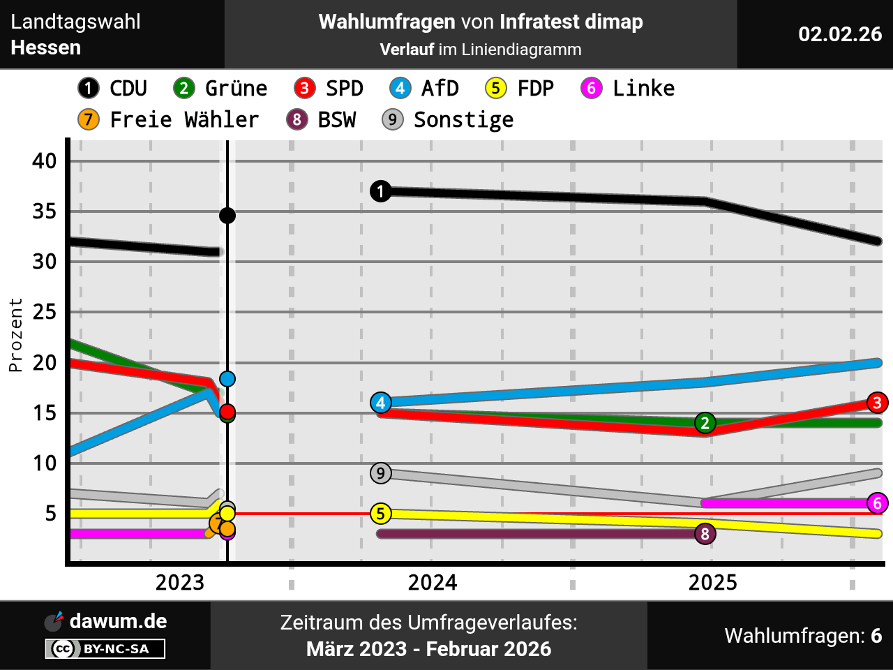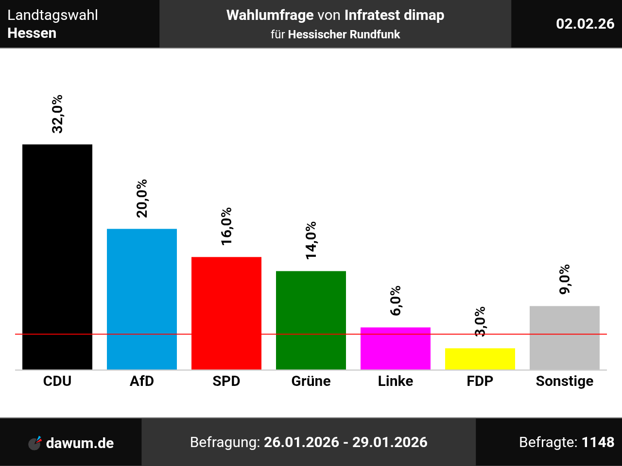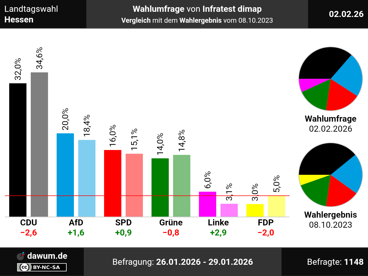 Diese Wahlumfrage (Sonntagsfrage) zur Landtagswahl in Hessen wurde von Infratest dimap im Auftrag von Hessischer Rundfunk durchgeführt und am 02.02.2026 insbesondere bei hessenschau.de veröffentlicht. Die Mixed-Befragung (telefonisch und online) fand zwischen dem 26.01.2026 und dem 29.01.2026 bei 1148 Wahlberechtigten statt.