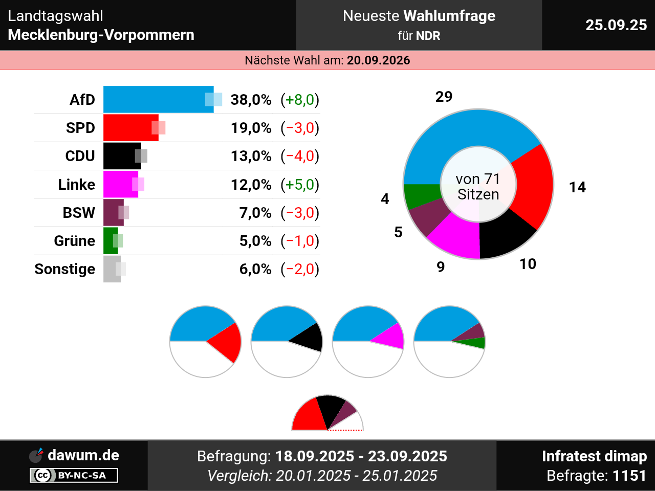 Die neueste Wahlumfrage (Sonntagsfrage) zur Landtagswahl in Mecklenburg-Vorpommern wurde von Infratest dimap im Auftrag von NDR durchgeführt und am 25.09.2025 insbesondere bei ndr.de veröffentlicht. Die Mixed-Befragung (telefonisch und online) fand zwischen dem 18.09.2025 und dem 23.09.2025 bei 1151 Wahlberechtigten statt.