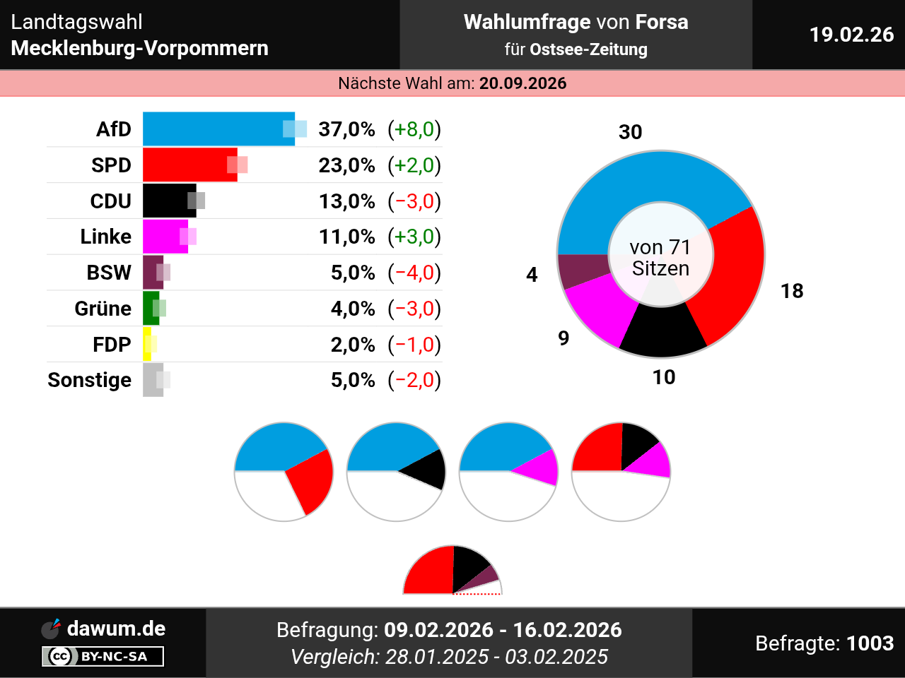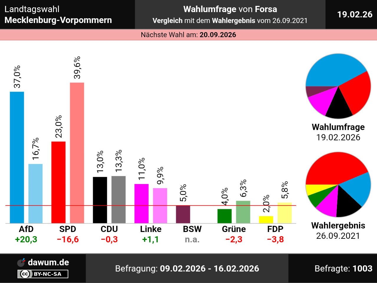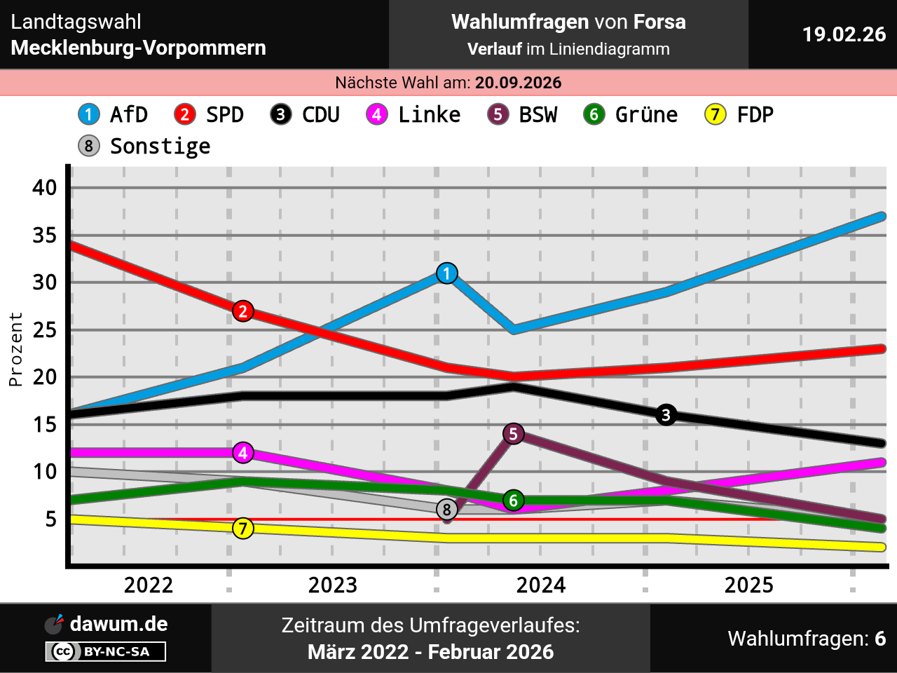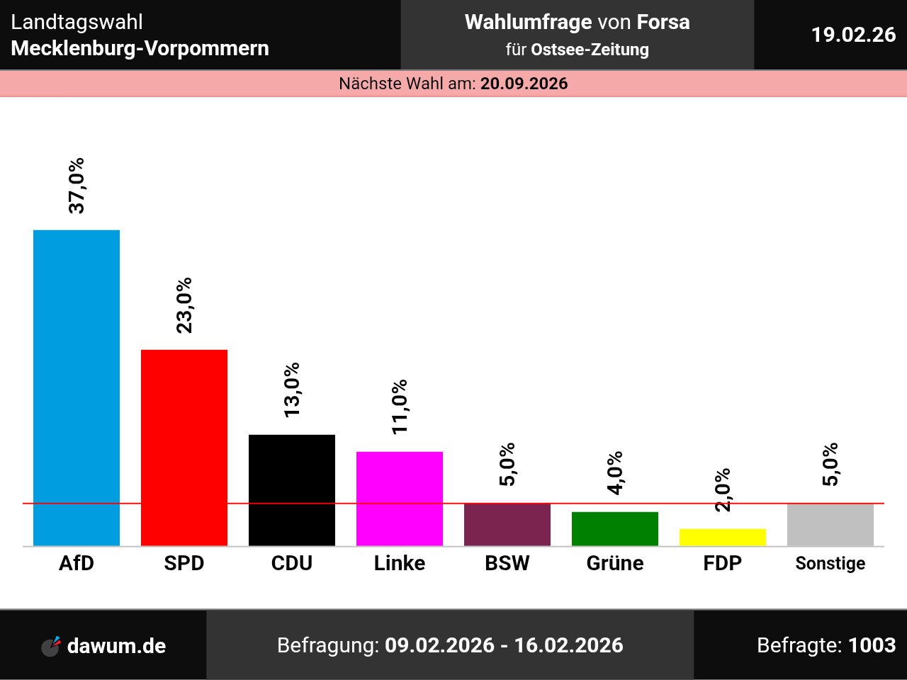 Diese Wahlumfrage (Sonntagsfrage) zur Landtagswahl in Mecklenburg-Vorpommern wurde von Forsa im Auftrag von Ostsee-Zeitung durchgeführt und am 19.02.2026 insbesondere bei ndr.de veröffentlicht. Die Mixed-Befragung (telefonisch und online) fand zwischen dem 09.02.2026 und dem 16.02.2026 bei 1003 Wahlberechtigten statt.