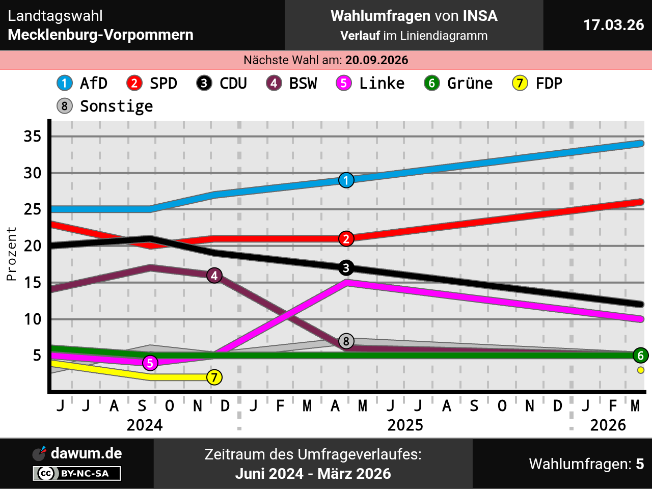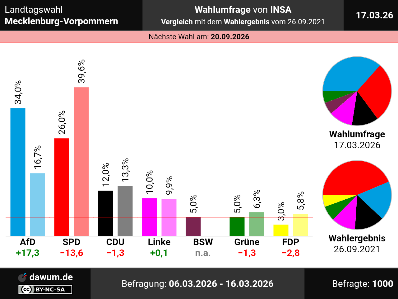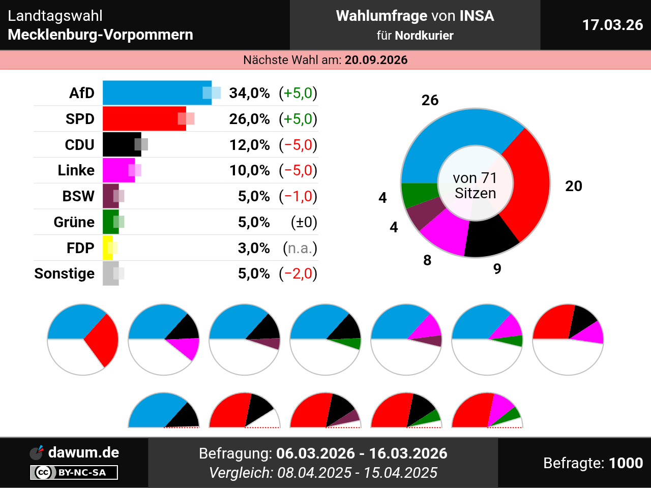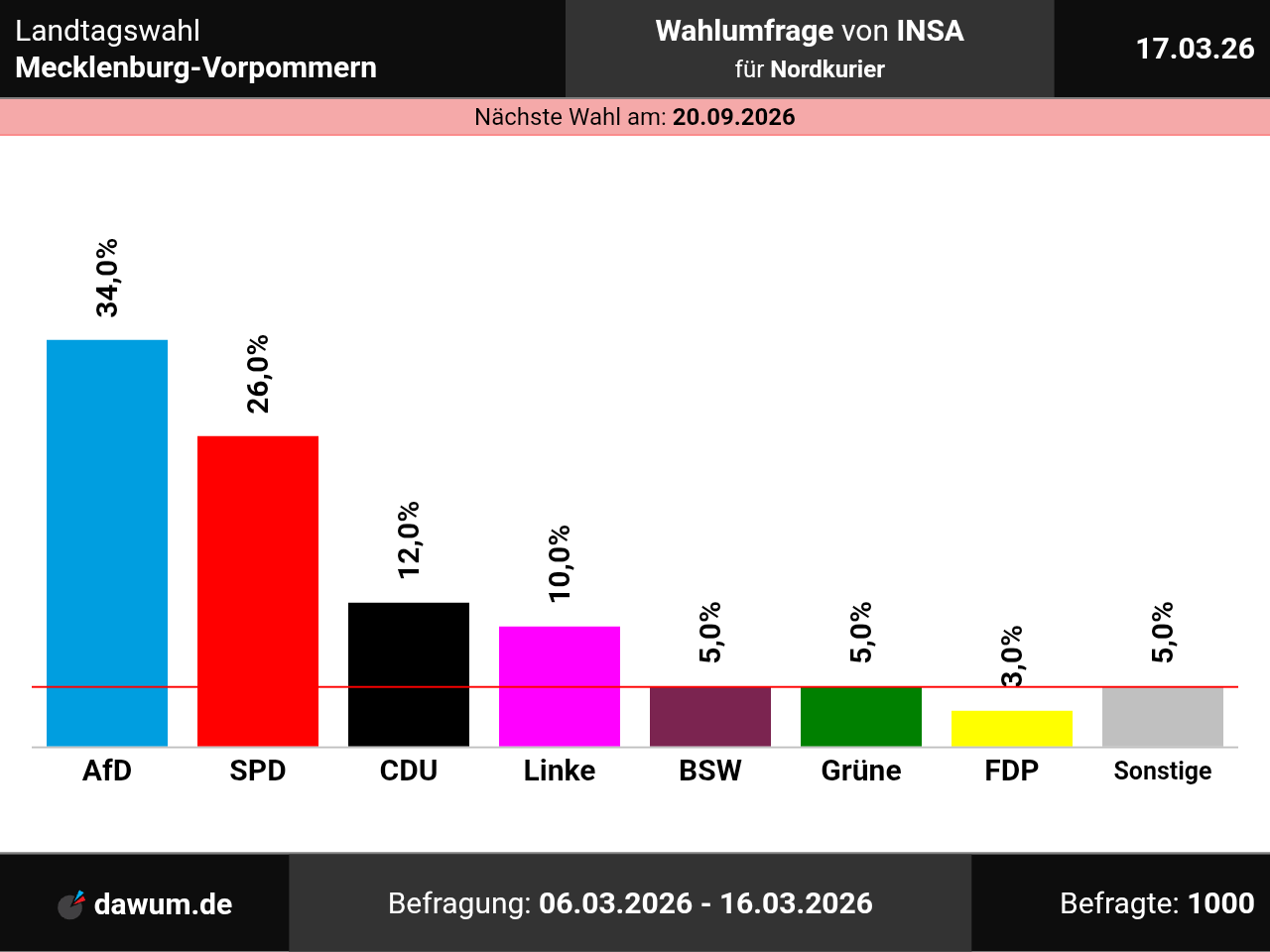 Diese Wahlumfrage (Sonntagsfrage) zur Landtagswahl in Mecklenburg-Vorpommern wurde von INSA im Auftrag von Nordkurier durchgeführt und am 17.03.2026 insbesondere bei nordkurier.de veröffentlicht. Die Online-Befragung fand zwischen dem 06.03.2026 und dem 16.03.2026 bei 1000 Wahlberechtigten statt.
