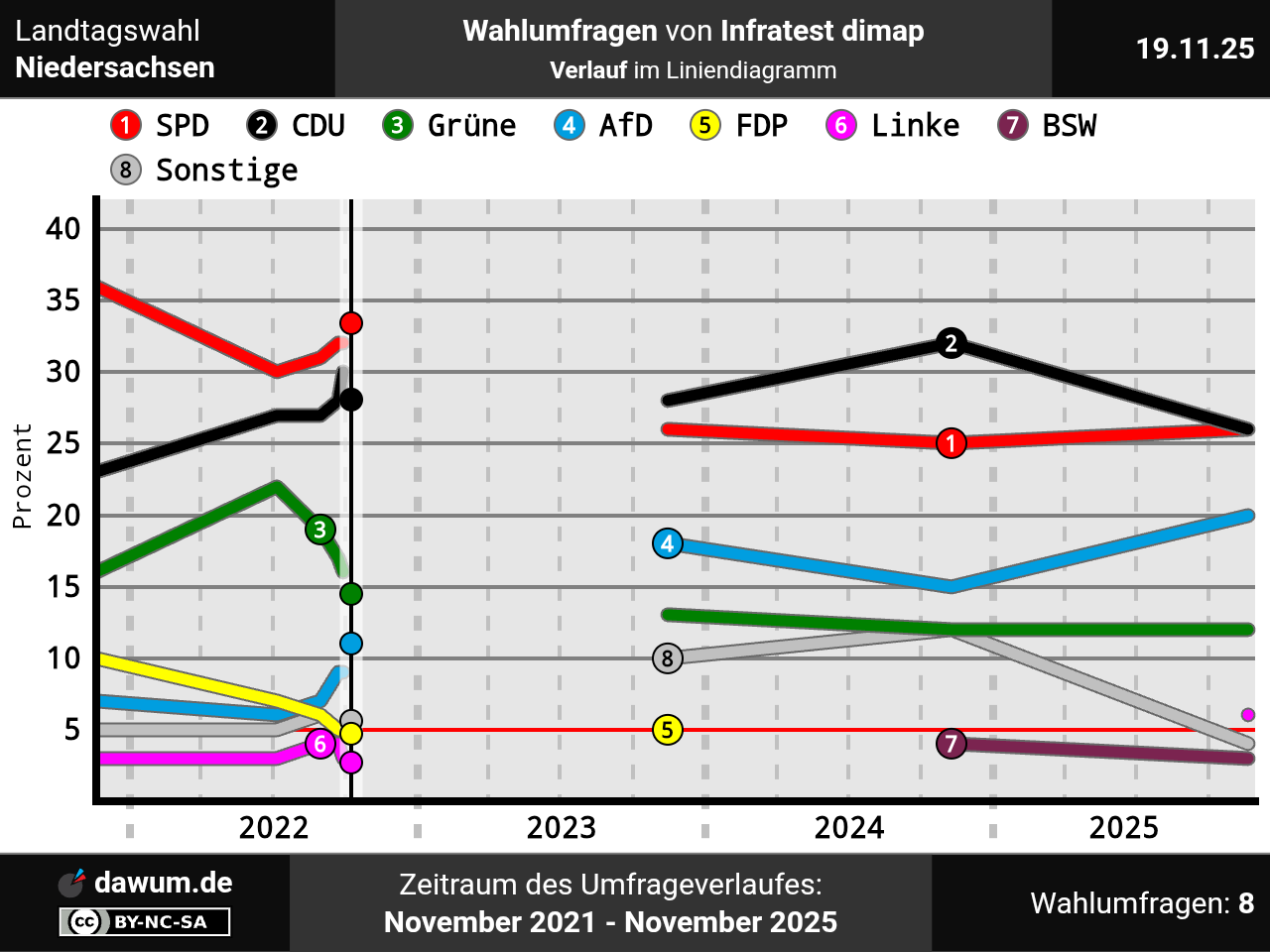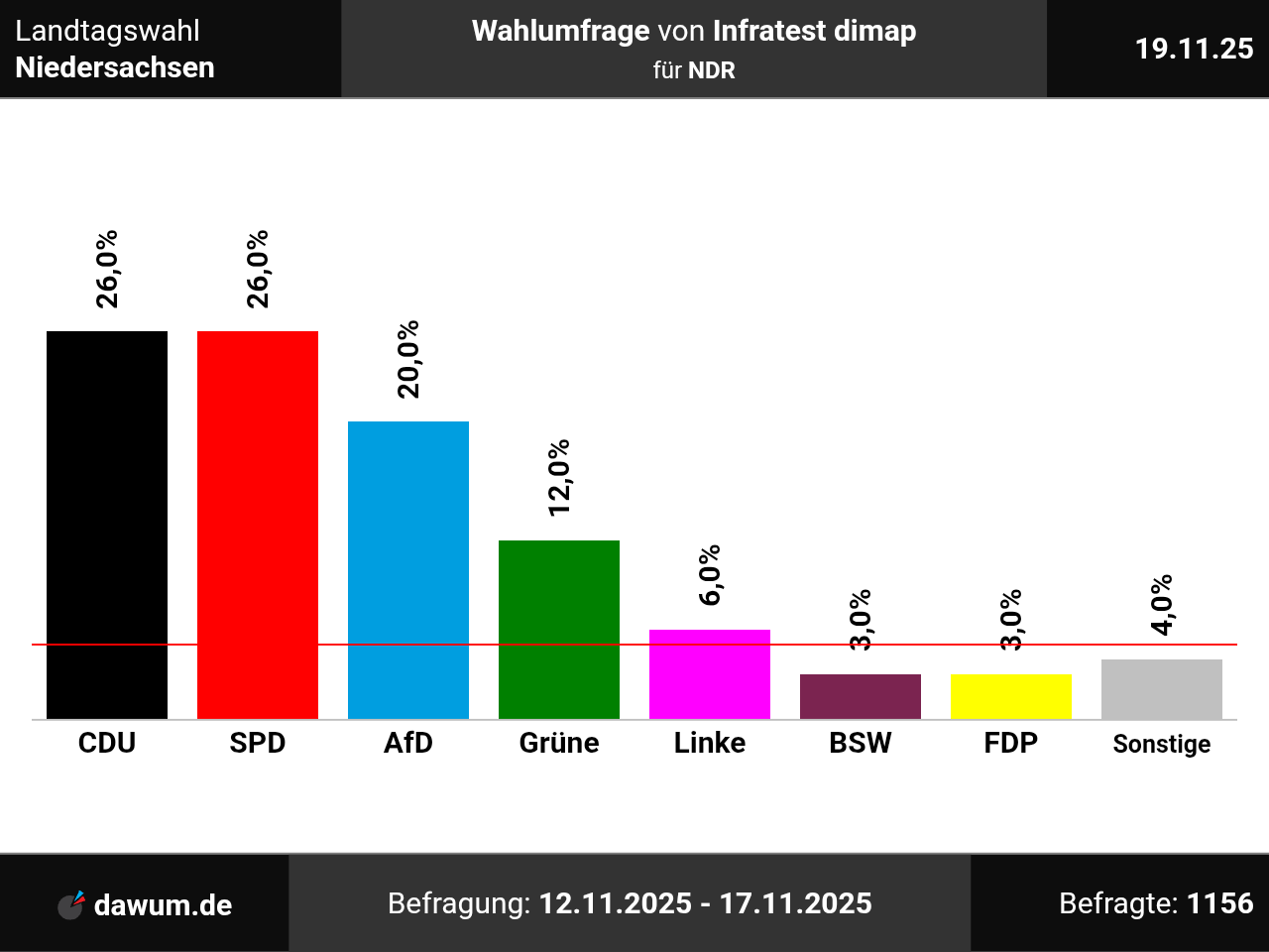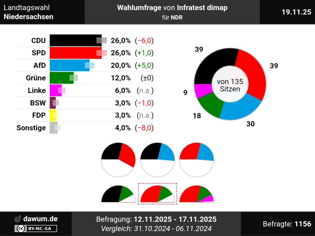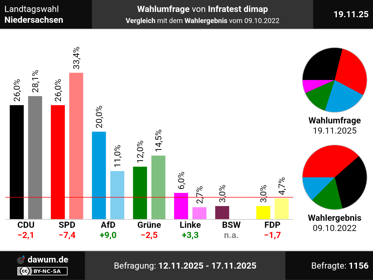 Die neueste Wahlumfrage (Sonntagsfrage) von Infratest dimap zur Landtagswahl in Niedersachsen wurde im Auftrag von NDR durchgeführt und am 19.11.2025 insbesondere bei ndr.de veröffentlicht. Die Mixed-Befragung (telefonisch und online) fand zwischen dem 12.11.2025 und dem 17.11.2025 bei 1156 Wahlberechtigten statt.