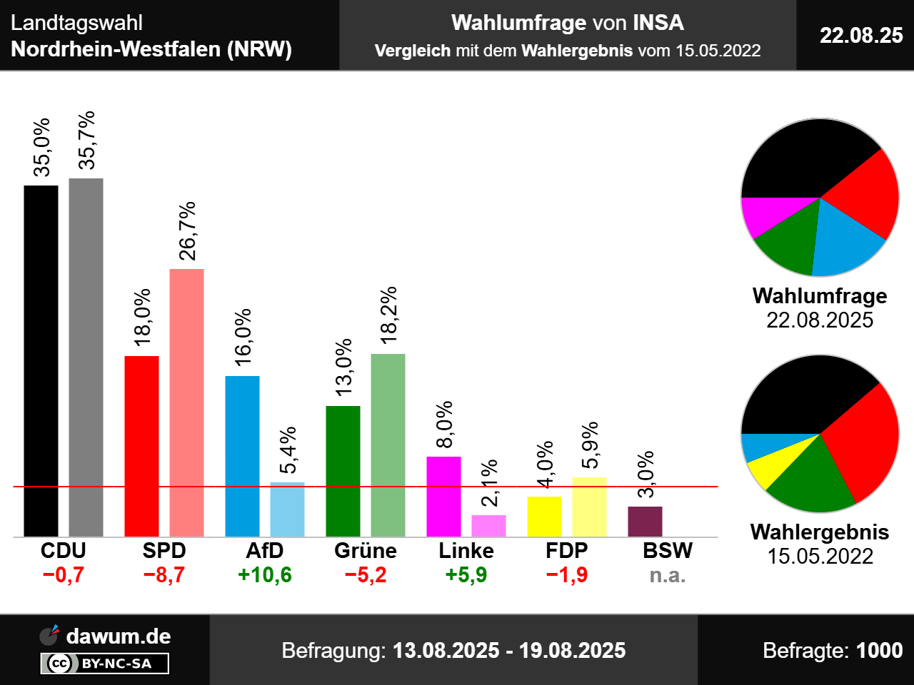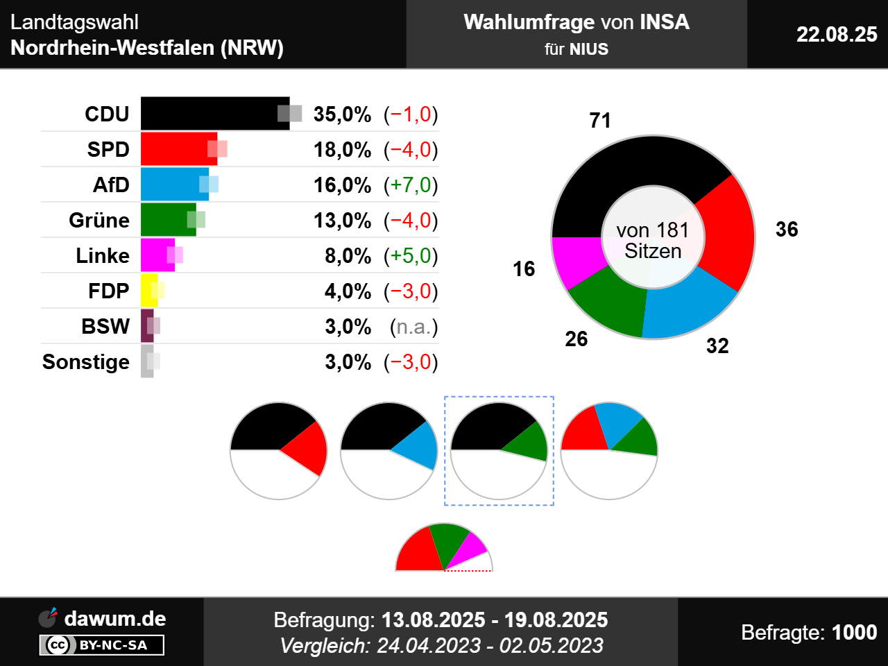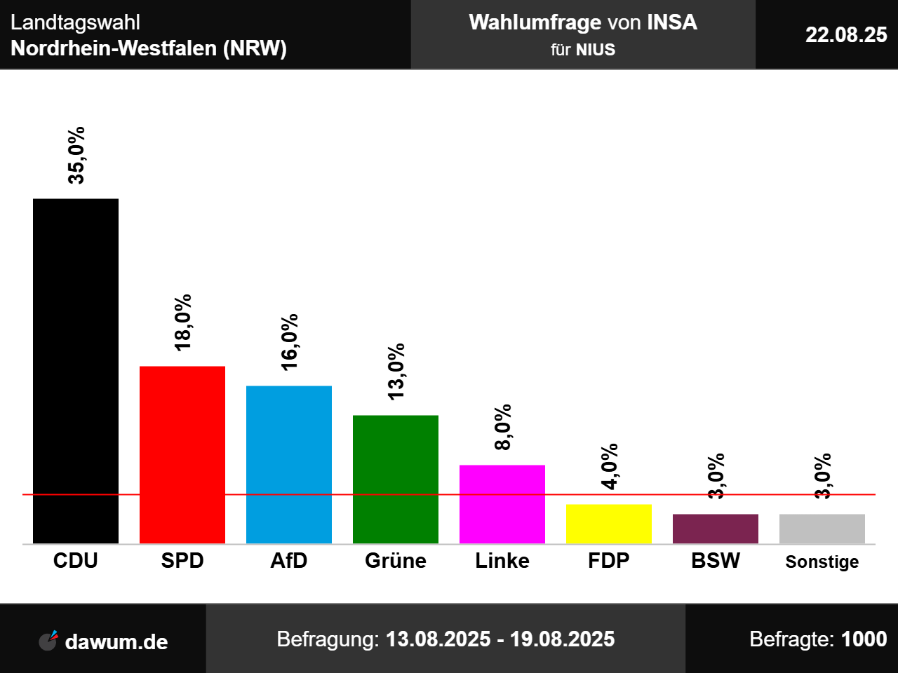 Die neueste Wahlumfrage (Sonntagsfrage) von INSA zur Landtagswahl in Nordrhein-Westfalen (NRW) wurde im Auftrag von NIUS durchgeführt und am 22.08.2025 insbesondere bei nius.de veröffentlicht. Die Online-Befragung fand zwischen dem 13.08.2025 und dem 19.08.2025 bei 1000 Wahlberechtigten statt.
