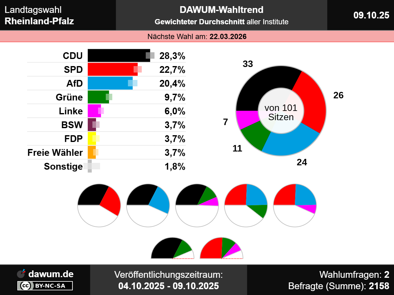 Dieser Wahltrend zur Landtagswahl in Rheinland-Pfalz wertet insgesamt 2 Wahlumfragen aus, die im Zeitraum vom 04.10.2025 bis zum 09.10.2025 veröffentlicht wurden, und berechnet deren gewichteten Durchschnitt. Zusammengerechnet wurden 2158 Wahlberechtigte befragt.