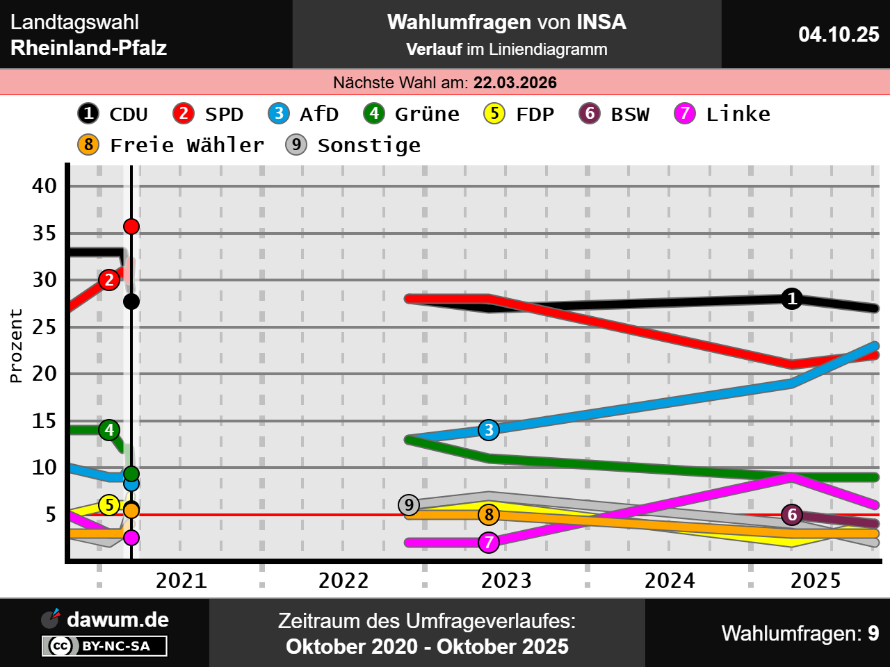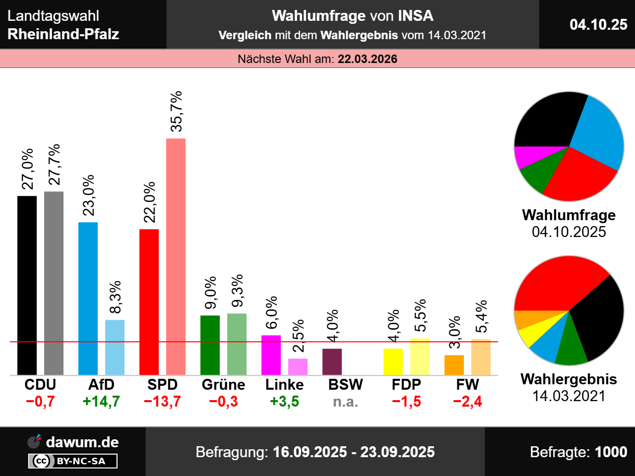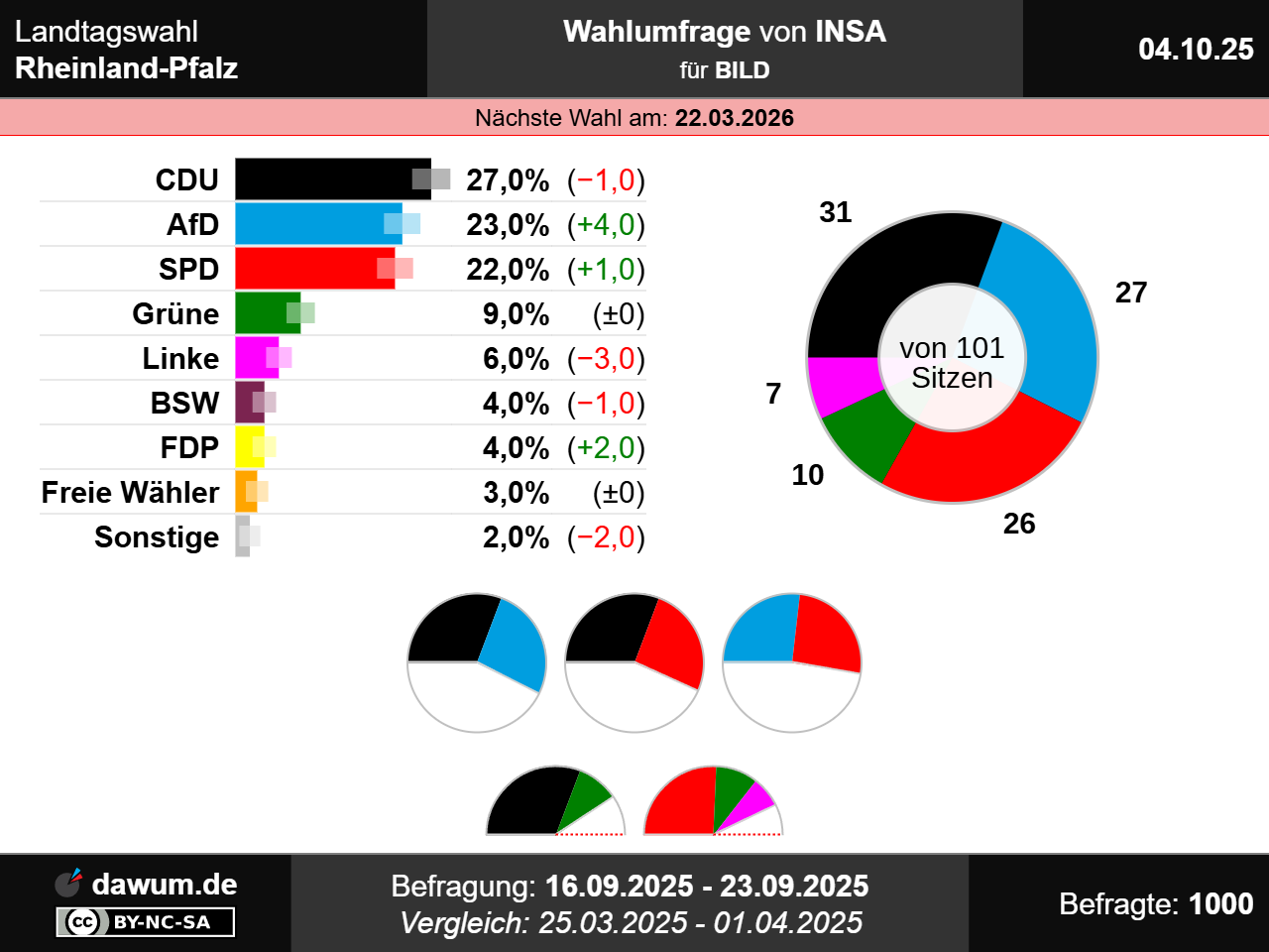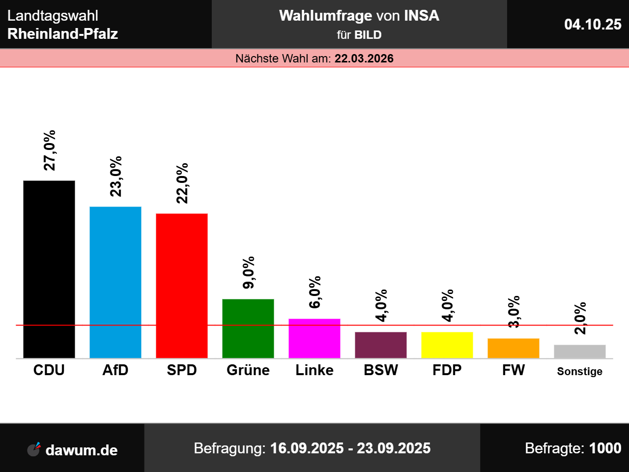 Diese Wahlumfrage (Sonntagsfrage) zur Landtagswahl in Rheinland-Pfalz wurde von INSA im Auftrag von BILD durchgeführt und am 04.10.2025 insbesondere bei msn.com und wahlrecht.de veröffentlicht. Die Online-Befragung fand zwischen dem 16.09.2025 und dem 23.09.2025 bei 1000 Wahlberechtigten statt.