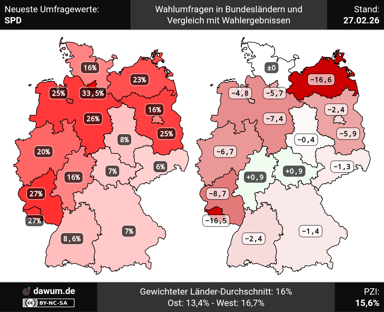 Im neuesten Wahltrend zur Bundestagswahl hat die SPD aktuell 15,2%. In den Bundesländern kommt die SPD im nach Einwohnern gewichteten Durchschnitt zu den Landtagswahlen auf 16,1%, wobei er in den alten Bundesländern 16,7% und in den neuen Bundesländern (mit Berlin) 13,4% beträgt. Ihren höchsten aktuellen Umfragewert erreicht die SPD im Bundesland Hamburg (33,5%). Demgegenüber erreicht die SPD in den Bundesländern Sachsen-Anhalt (8%), Bayern und Thüringen (jeweils 7%) sowie Sachsen (6%) ihre niedrigsten aktuellen Umfragewerte. Der Parteizustimmungsindex (PZI) von der SPD beträgt aktuell 15,6%.