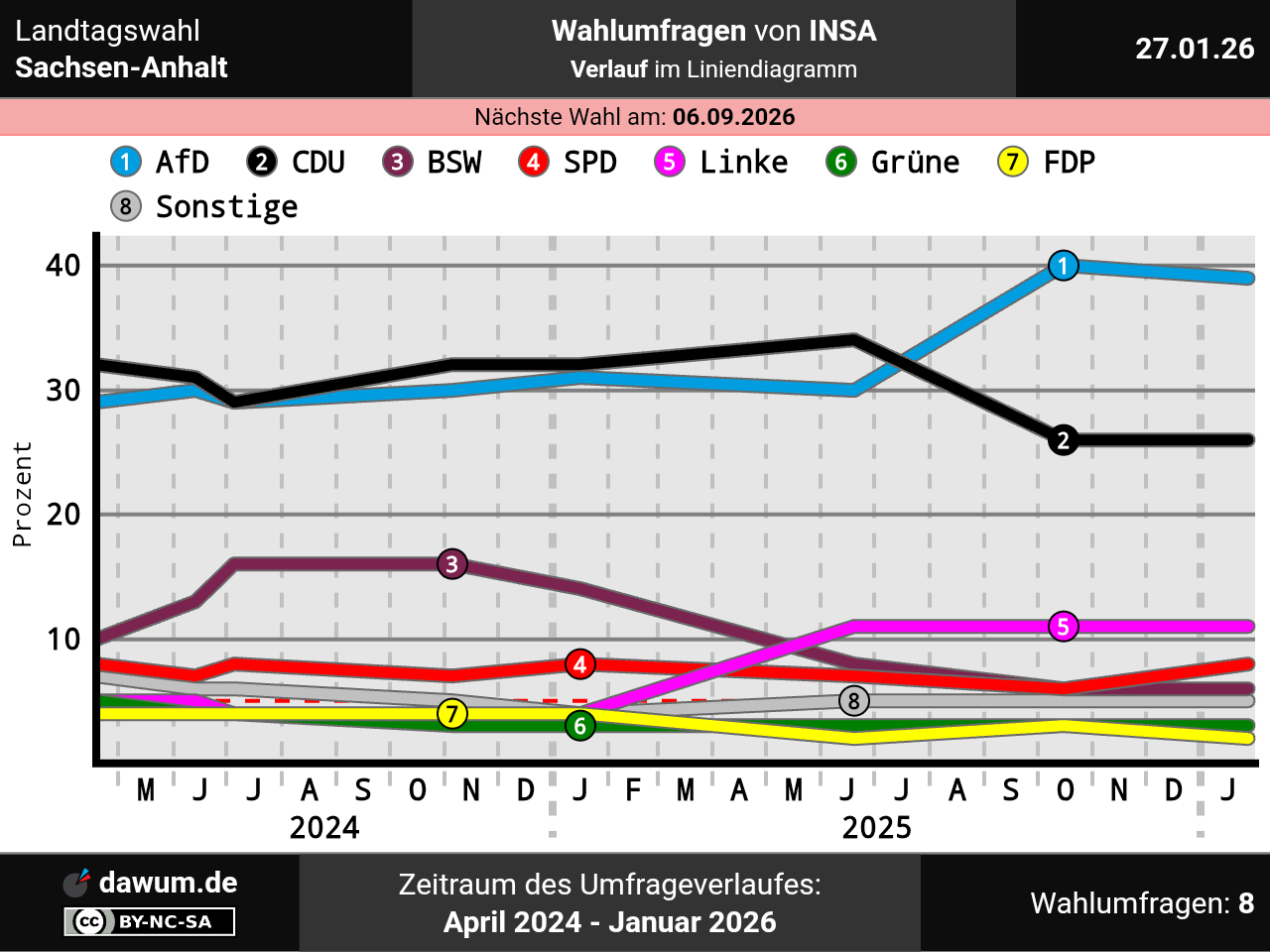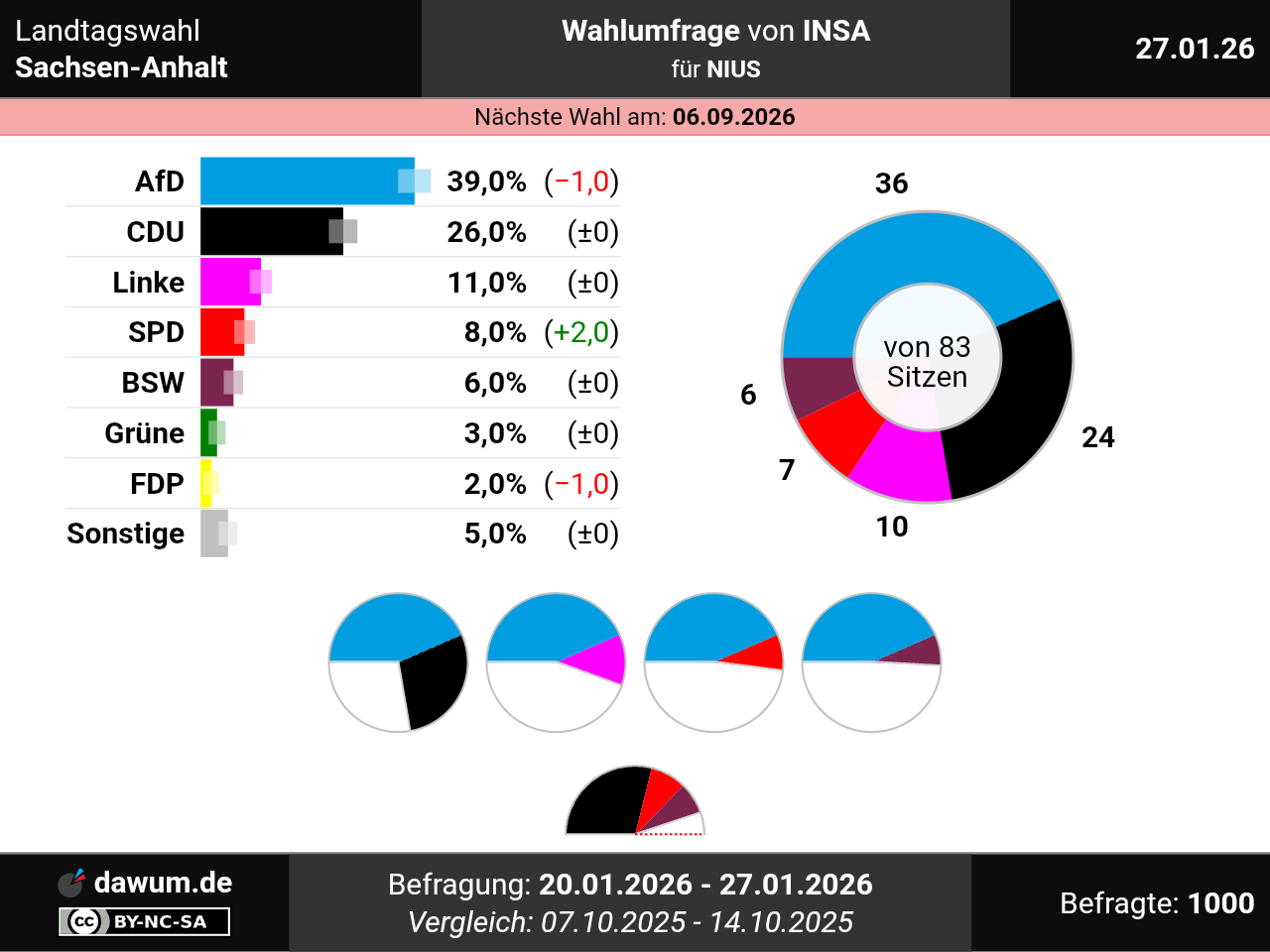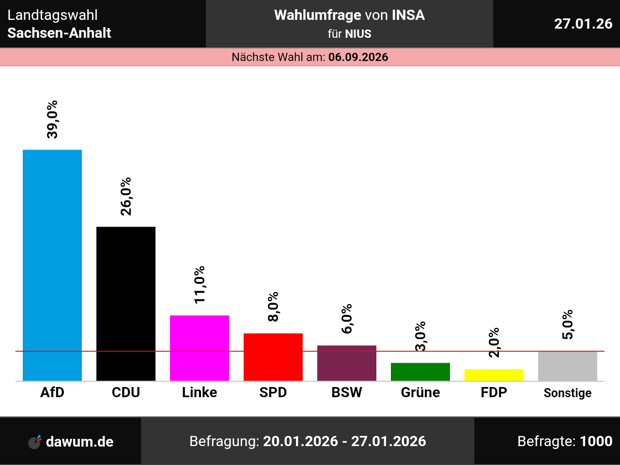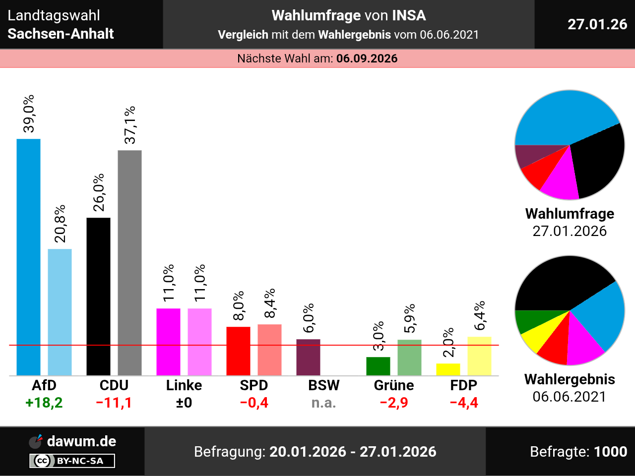 Diese Wahlumfrage (Sonntagsfrage) zur Landtagswahl in Sachsen-Anhalt wurde von INSA im Auftrag von NIUS durchgeführt und am 27.01.2026 insbesondere bei nius.de veröffentlicht. Die Online-Befragung fand zwischen dem 20.01.2026 und dem 27.01.2026 bei 1000 Wahlberechtigten statt.
