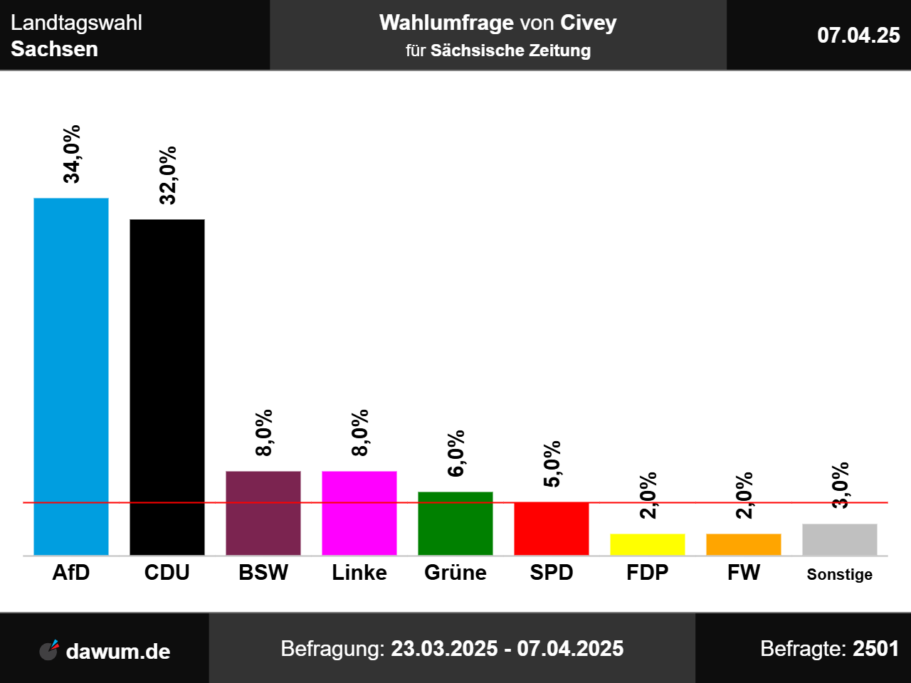 Diese Wahlumfrage (Sonntagsfrage) zur Landtagswahl in Sachsen wurde von Civey im Auftrag von Sächsische Zeitung durchgeführt und am 07.04.2025 insbesondere bei saechsische.de veröffentlicht. Die Online-Befragung fand zwischen dem 23.03.2025 und dem 07.04.2025 bei 2501 Wahlberechtigten statt.