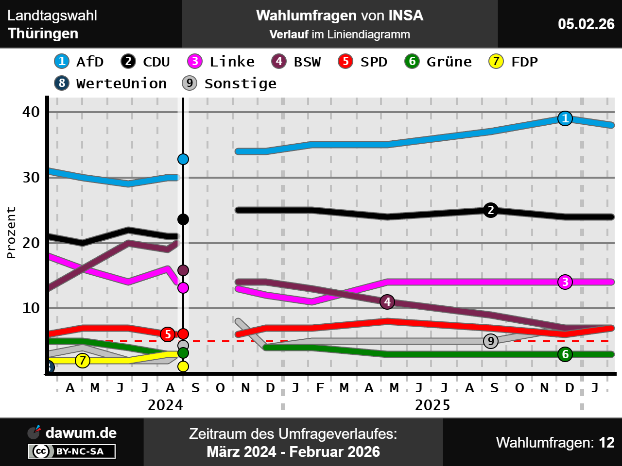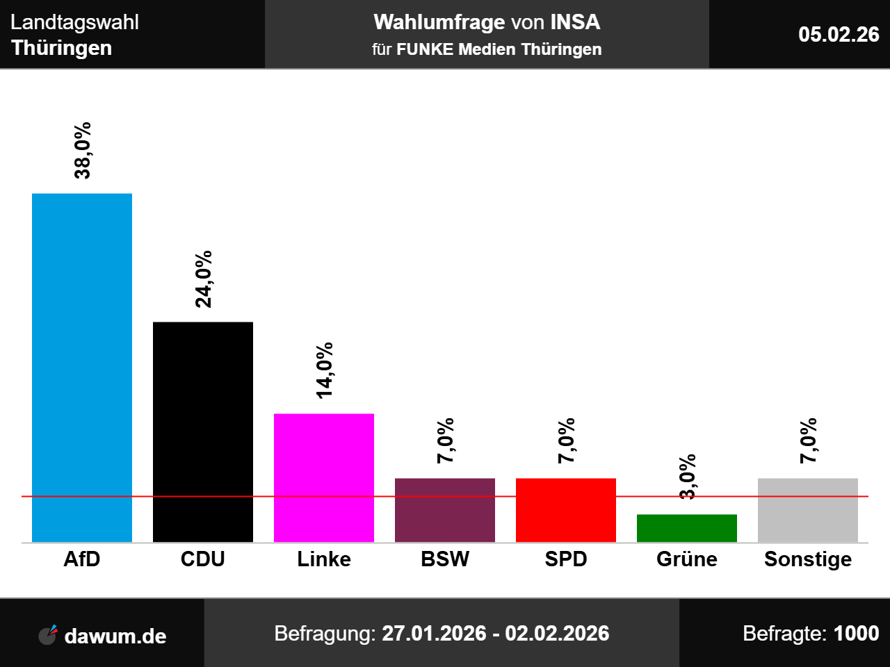 Diese Wahlumfrage (Sonntagsfrage) zur Landtagswahl in Thüringen wurde von INSA im Auftrag von FUNKE Medien Thüringen durchgeführt und am 05.02.2026 insbesondere bei welt.de und wahlrecht.de veröffentlicht. Die Online-Befragung fand zwischen dem 27.01.2026 und dem 02.02.2026 bei 1000 Wahlberechtigten statt.